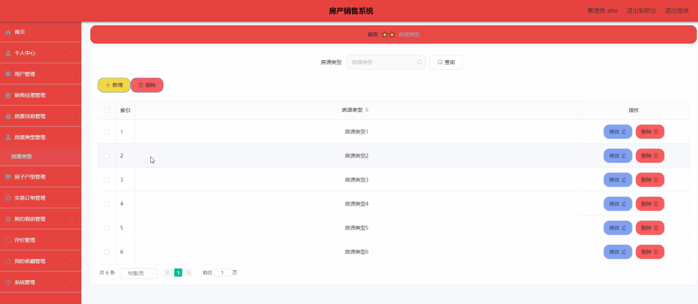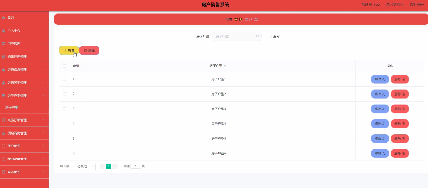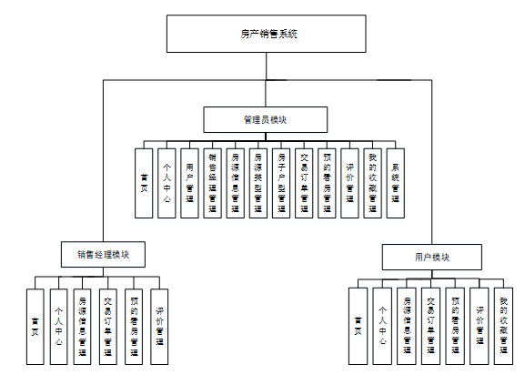 模块包括主界面,首页、个人中心、用户管理、销售经理管理、房源信息管理、房源类型管理、房子户型管理、交易订单管理、预约看房管理、评价管理、我的收藏管理、系统管理等进行相应的操作。