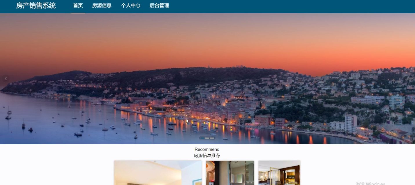 房产销售系统,在前台首页可以查看首页、房源信息、个人中心、后台管理等内容,如图5-14所示。