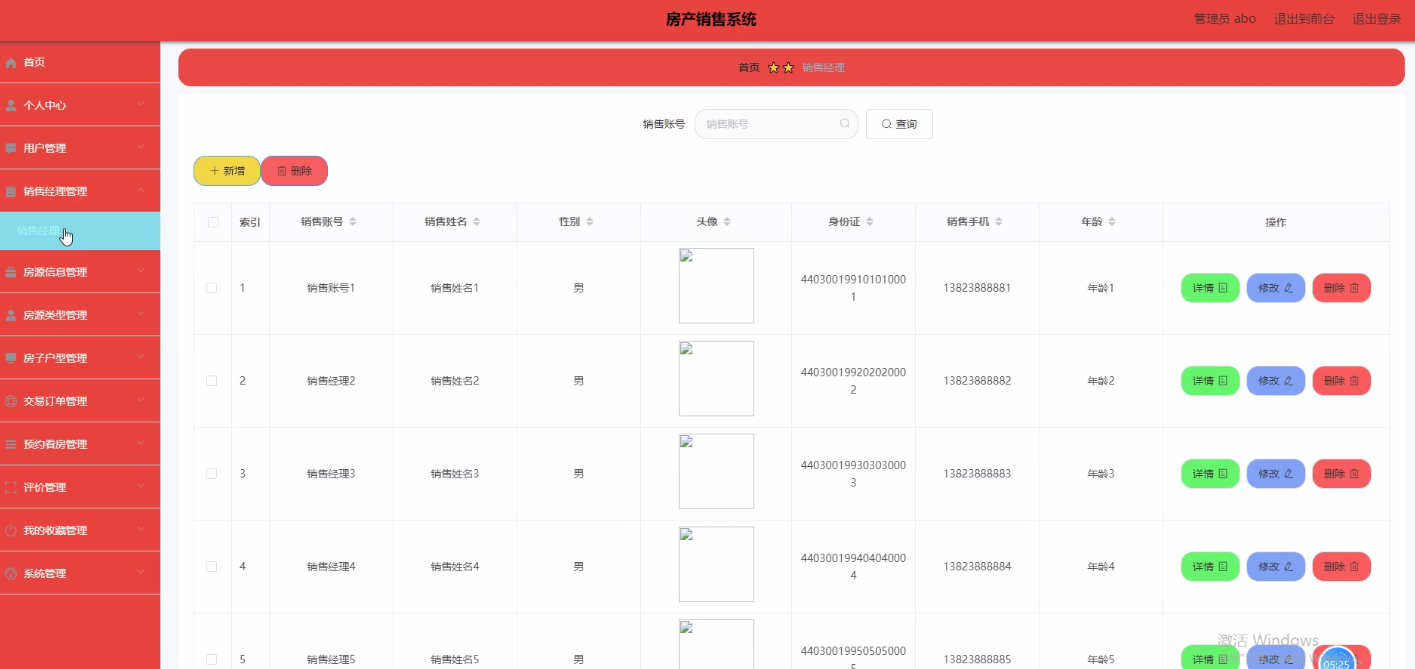 销售经理管理:通过列表可以获取销售账号、销售姓名、性别、头像、身份证、销售手机、年龄等信息,进行详情、删除或修改等操作,如图5-7所示。