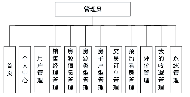 管理员登录后可进行首页、个人中心、用户管理、销售经理管理、房源信息管理、房源类型管理、房子户型管理、交易订单管理、预约看房管理、评价管理、我的收藏管理、系统管理,管理员的用例如图3-1所示。