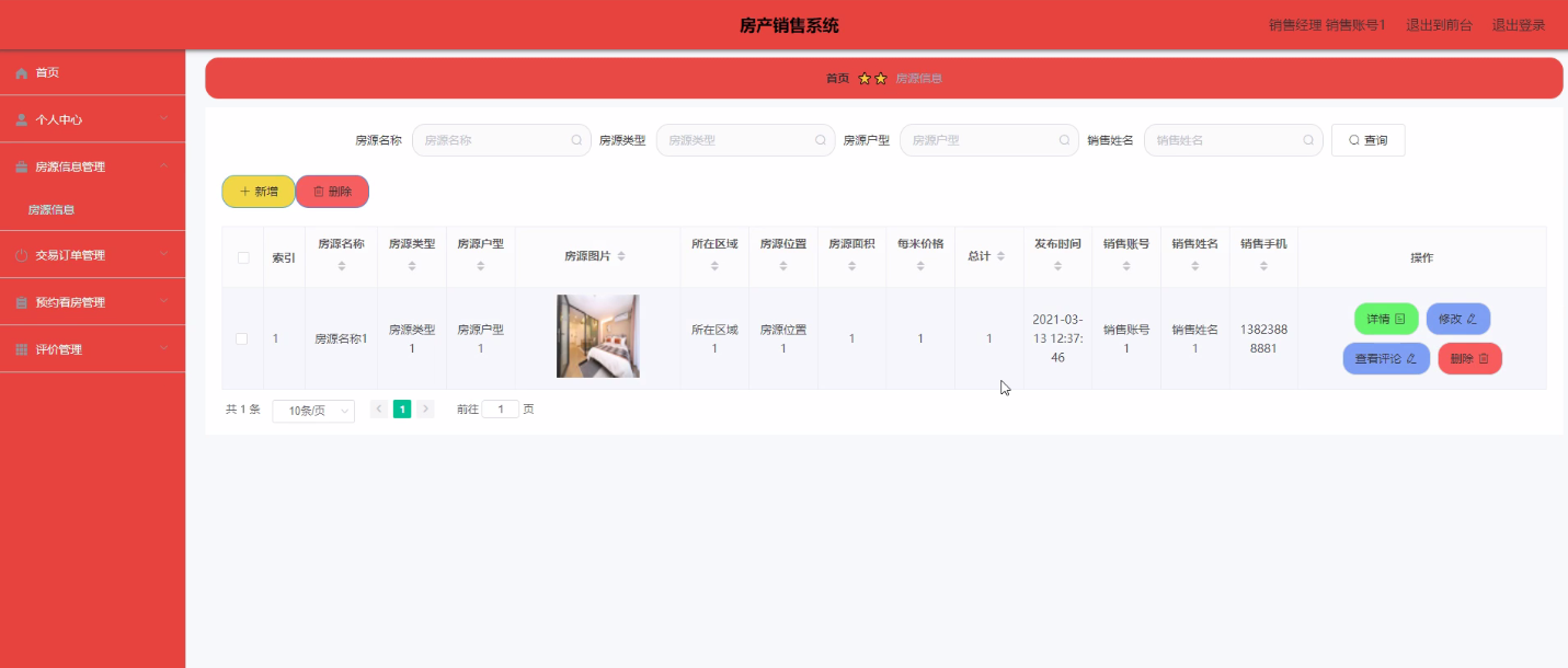 销售经理可以实现首页、个人中心、房源信息管理、交易订单管理、预约看房管理、评价管理等。