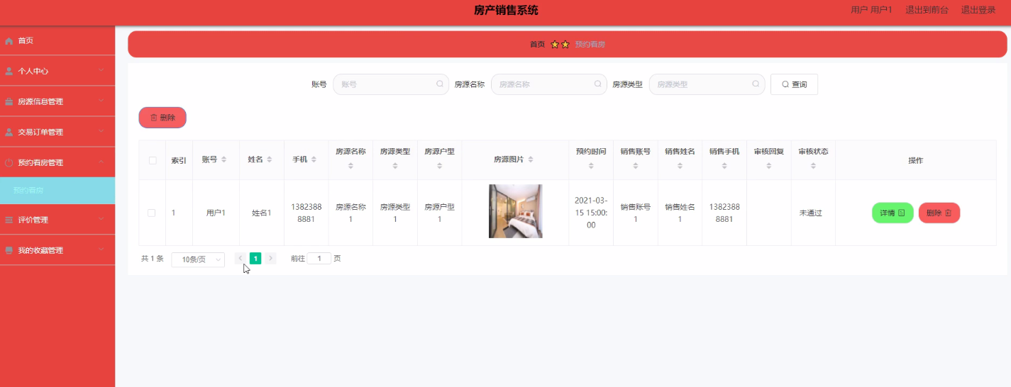 预约看房管理:通过列表可以获取账号、姓名、手机、房源名称、房源类型、房源户型、房源图片、预约时间、销售账号、销售姓名、销售手机、审核回复、审核状态等信息,进行详情、删除操作,如图5-4所示。