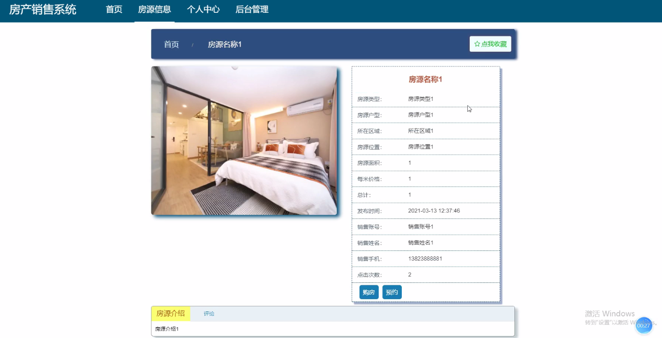 房源信息,在房源信息页面通过填写房源名称、房源类型、房源户型、房源图片、所在区域、房源位置、房源面积、每米价格、总计、发布时间、销售账号、销售姓名、销售手机等信息进行购房、预约及点我收藏等操作,如图5-15所示。