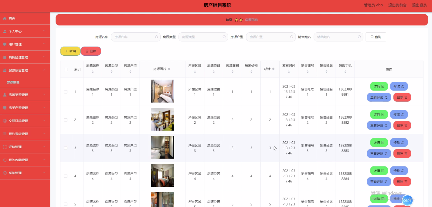 房源信息管理:通过列表可以获取房源名称、房源类型、房源户型、房源图片、所在区域、房源位置、房源面积、每米价格、总计、发布时间、销售账号、销售姓名、销售手机等信息,进行详情、修改、查看评论、删除等操作,如图5-8所示。