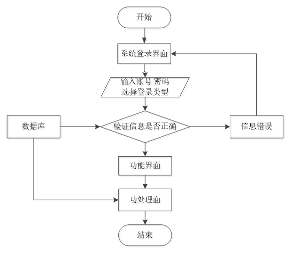 用户想进入系统,首先进入系统登录界面,通过正确的用户名、密码,选择登录类型登录,系统会检查登录信息,信息正确,然后输入相应的功能界面,提示信息错误,登录失败。系统操作流程如图3-4所示。