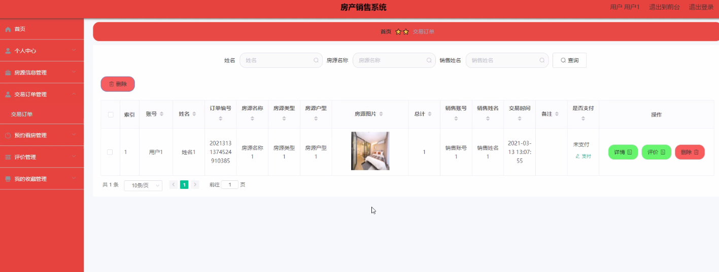 交易订单管理:通过列表可以获取账号、姓名、订单编号、房源名称、房源类型、房源户型、房源图片、总计、销售账号、销售姓名、交易时间、备注、是否支付等信息,进行详情、评价、删除等操作,如图5-3所示。