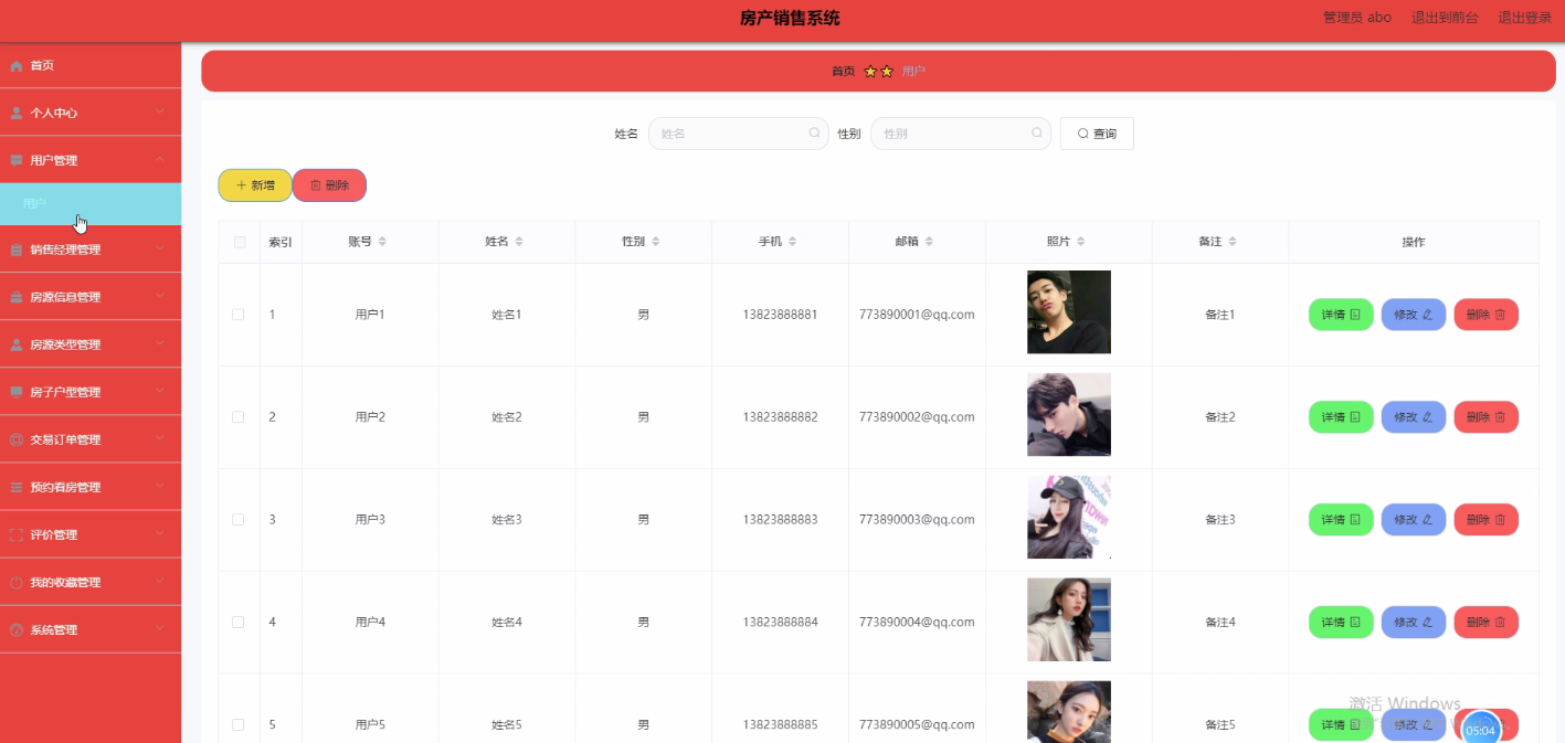 用户管理:通过列表可以获取账号、姓名、性别、手机、邮箱、照片、备注等内容,可以进行详情、修改或删除等操作,如图5-6所示。