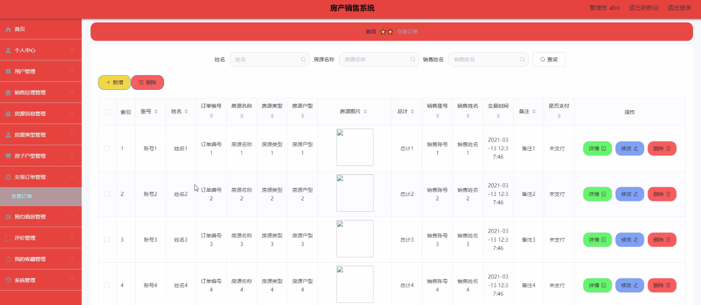 交易订单管理:通过列表可以获取账号、姓名、订单编号、房源名称、房源类型、房源户型、房源图片、总计、销售账号、销售姓名、交易时间、备注、是否支付等信息,进行详情、修改或删除操作,如图5-11所示。