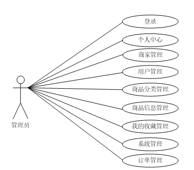 (2)管理员:管理员登录后可对系统进行全面的管理,主要功能模块包括个人中心、用户管理、商家管理、商品分类管理、商品信息管理、我的收藏管理、系统管理以及订单管理。管理员用例图如图3-2所示。