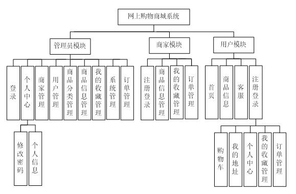 本基于Spring Boot的网上购物商城系统主要包括用户模块、商家模块和管理员模块,根据第三章中系统功能需求分析,可画出本基于Spring Boot的网上购物商城系统的结构图如图4-1所示: