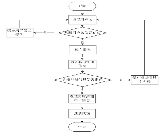 未有账号的用户可进行注册操作,在注册时系统会判断用户名是否已存在,已存在的话,提示返回重新填写用户名,用户名不存在,填写其他注册信息,系统判断注册信息是否正确,正确则在数据库中添加用户信息,注册成功。用户注册流程图如图3-4所示。