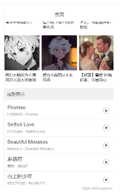2.引入api里的网络请求方法, 把数据请求回来, 循环铺设import { recommendMusicAPI} from "@/api"; export default { data() { return { reList: [], // 推荐歌单数据 }; }, async created() { const res = await recommendMusicAPI({ limit: 6, }); console.log(res); this.reList = res.data.result; }<p class="title">推荐歌单</p> <van-row gutter="6"> <van-col span="8" v-for="obj in reList" :key="obj.id"> <van-image width="100%" height="3rem" fit="cover" :src="obj.picUrl" /> <p class="song_name">{{ obj.name }}</p> </van-col> </van-row>