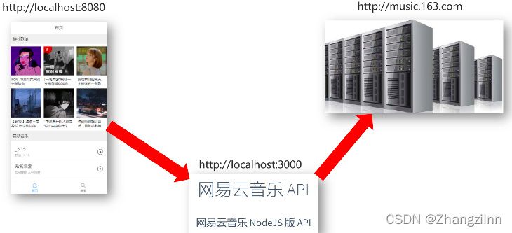 服务器之间不存在跨域问题!!!(自己的接口可以访问网易云音乐服务器上的数据)