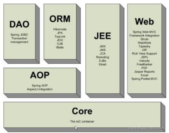 另外,这个模块提供了许多企业服务,例如电子邮件、JNDI访问、EJB集成、远程以及时序调度(scheduling)服务。也包括了对模版框架例如Velocity和FreeMarker集成的支持。