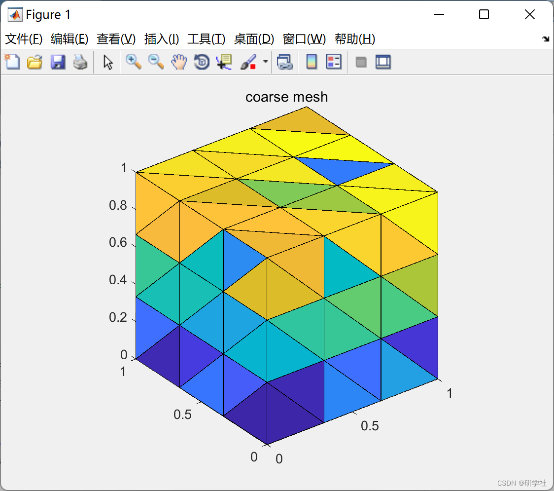 质量和刚度矩阵被组装成嵌套的均匀网格(2D 中的三角形和 3D 中的四面体),从具有少量元素的粗网格(level=1 网格)开始,到具有多达数百万元素的最精细网格(level=levels,其中级别是预定义的),具体取决于可用内存。
