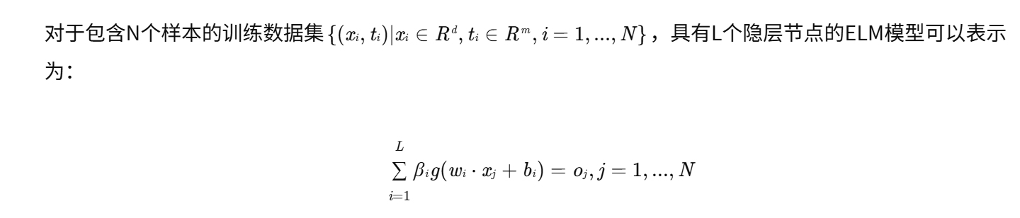 ELM的核心思想是随机初始化隐层节点的权重和偏置,然后通过最小二乘法求解输出层的权重,从而实现模型的训练。其数学表达如下: