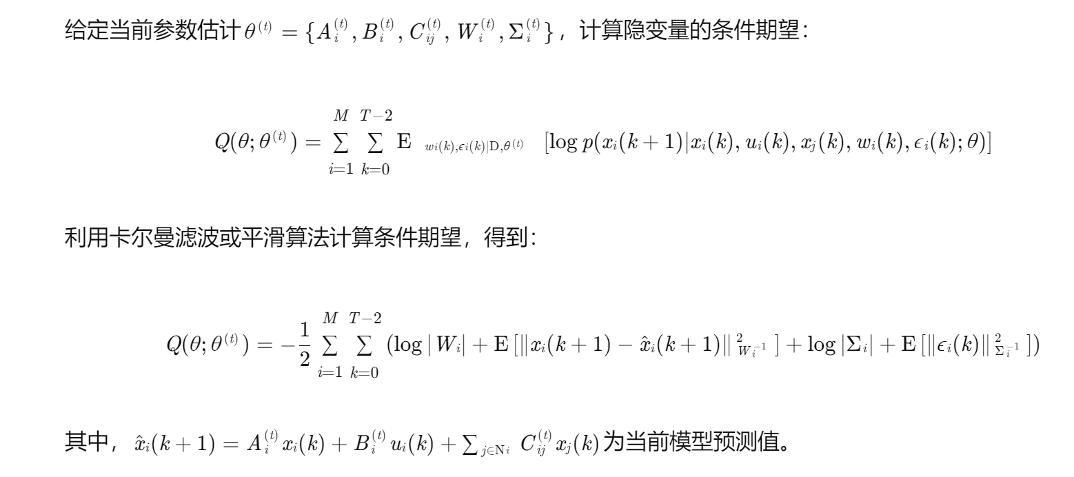 期望最大化(EM)算法作为一种迭代优化方法,通过交替执行期望步骤(E步)和最大化步骤(M步),能够有效处理含隐变量的复杂优化问题。本文将EM算法引入DMPC参数估计框架,提出基于EM的DMPC参数估计方法,通过分解全局优化问题为局部子问题,利用智能体间信息交互实现参数协同优化,在保证系统稳定性的同时提升参数估计精度。
