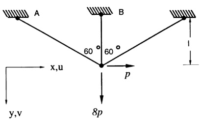 - 节点1和3固定于水平面,节点2承受外部载荷(如垂直力 PP 或复合力 Fx,FyFx,Fy)。
