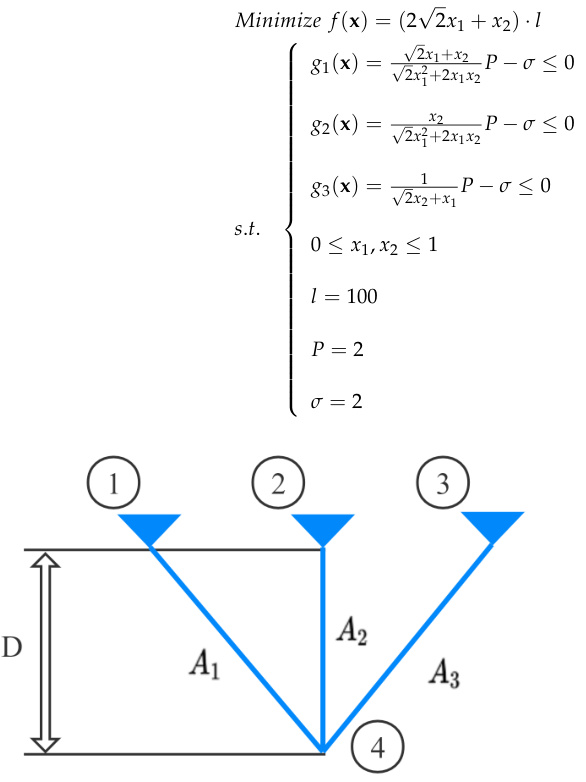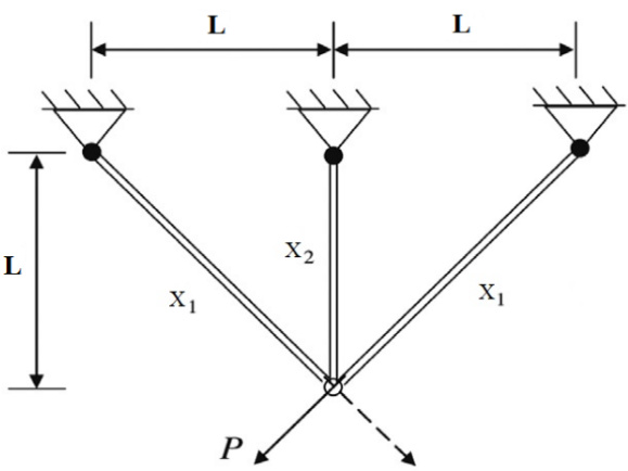 - 设计变量:杆件截面积 A1,A2,A3 和跨度 BB(范围 Ai∈[1,1000] in2], B∈[400,1000] in。