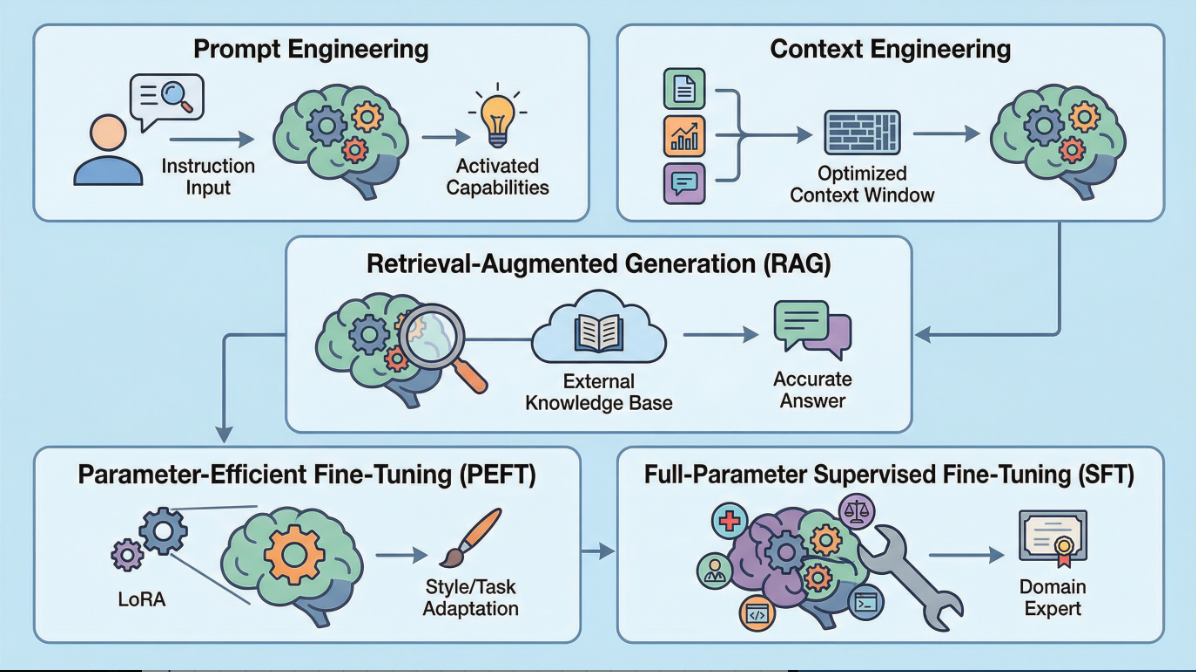 以下,我们将系统性地剖析五种核心技术:提示词工程(Prompt Engineering)、上下文工程 (Context Engineering)、检索增强生成(RAG),以及两种主要的微调(Fine-tuning)策略——全参数监督微调(SFT)与参数高效微调(PEFT, 以LoRA为例)。我们将它们理解为一个从“外部引导”到“内部改造”的连续谱。