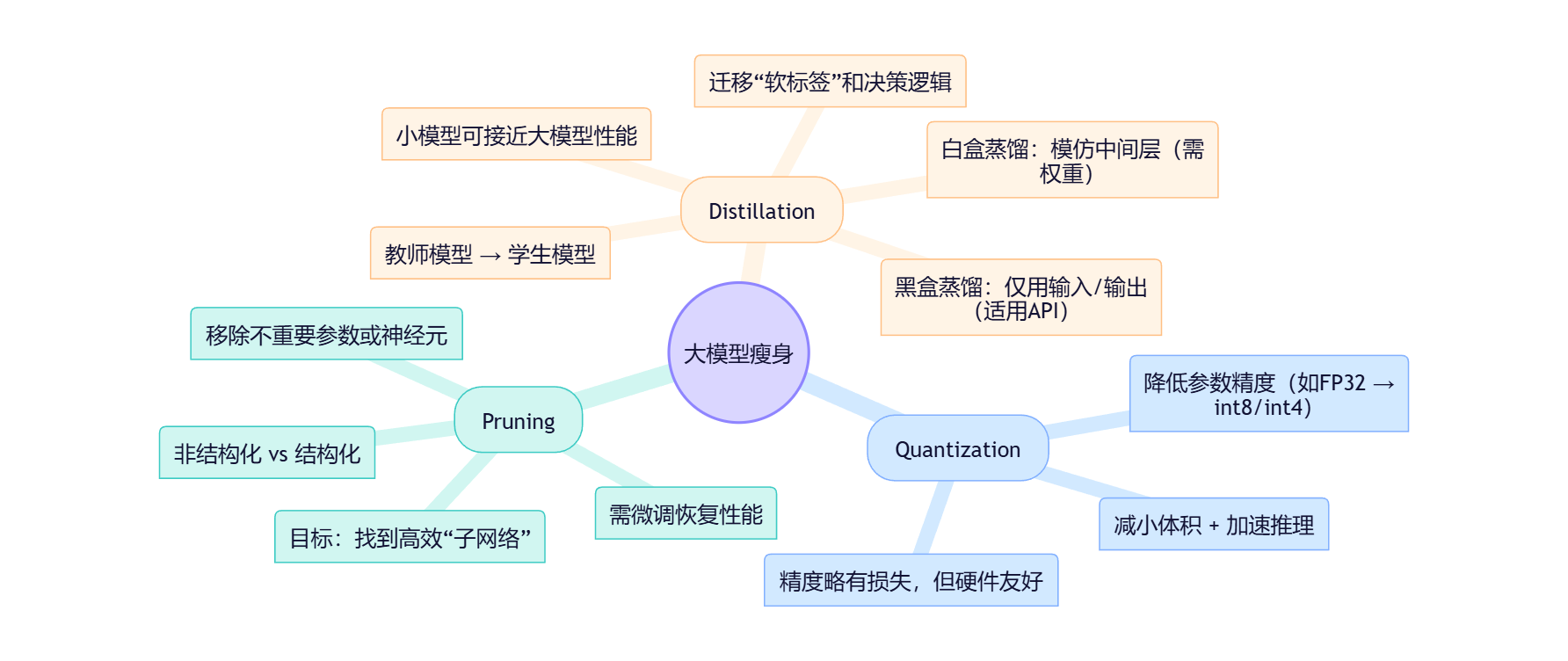 - 知识蒸馏 (Knowledge Distillation): 一种模型训练方法,让一个小的“学生模型”通过学习一个大的“教师模型”的输出来进行训练,从而将大模型的“知识”迁移到小模型中。