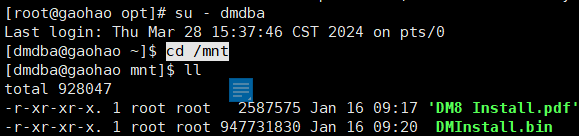 切换至 dmdba 用户下,在 /mnt 目录下使用命令行安装数据库程序,依次执行以下命令安装 DM 数据库。命令如下:
