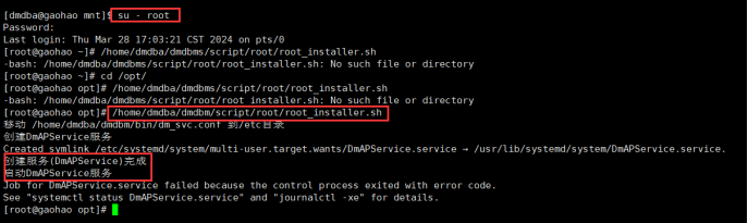 数据库安装完成后,需要切换至 root 用户执行上图中的命令 /home/dmdba/dmdbms/script/root/root_installer.sh 创建 DmAPService,否则会影响数据库备份。命令如下: