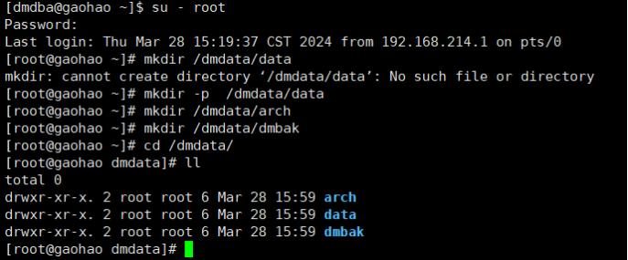 注:使用root用户创建文件夹。达梦数据库必须安装在自己的目录下。