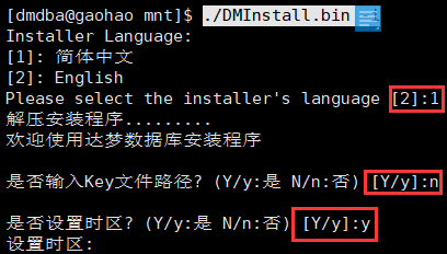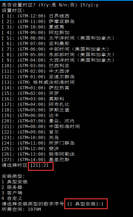 注:按需求选择安装语言,没有 key 文件选择 "n",时区按需求选择一般选择 “21”,安装类型选择“1”,安装目录按实际情况配置,这里示例使用默认安装位置。