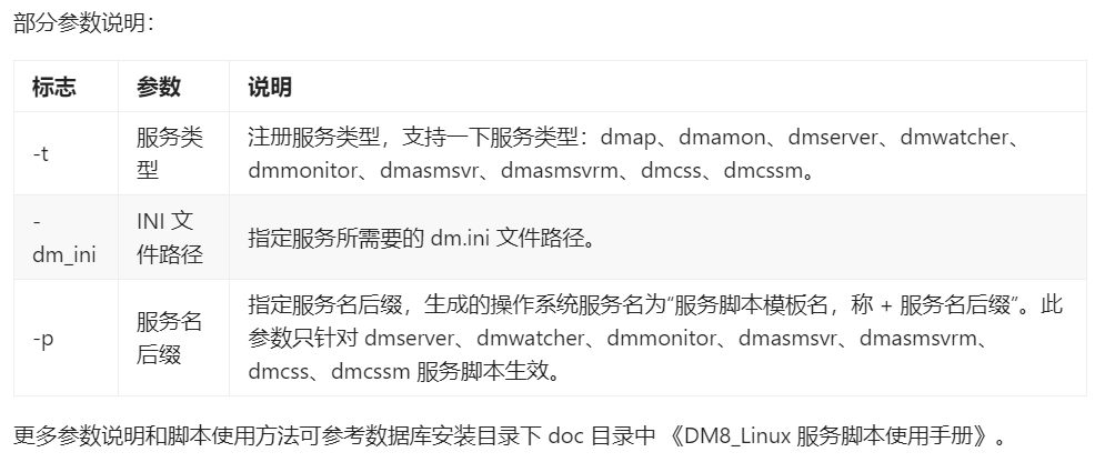 DM 提供了将 DM 服务脚本注册成操作系统服务的脚本,同时也提供了卸载操作系统服务的脚本。注册和卸载脚本文件所在目录为安装目录的“/script/root”子目录下。