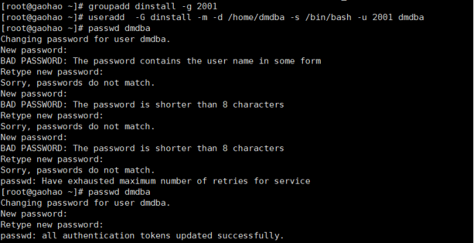创建用户:useradd -G dinstall -m -d /home/dmdba -s /bin/bash -u 2001 dmdba