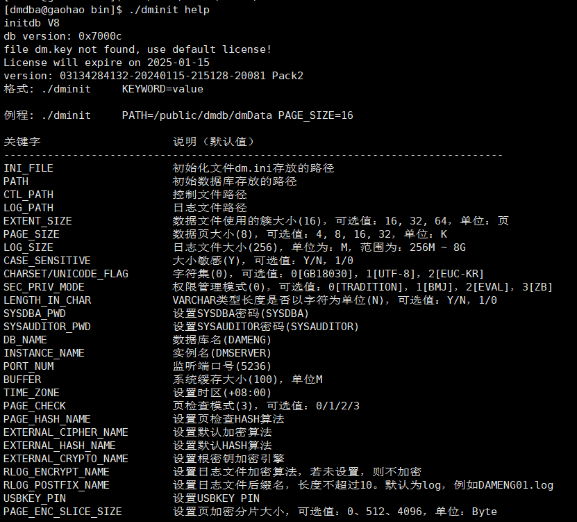 使用 dminit 命令初始化实例,dminit 命令可设置多种参数,命令如下: