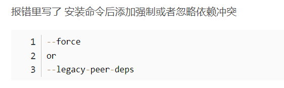 本文采用的解决方法,在命令后面加上 -legacy-peer-deps