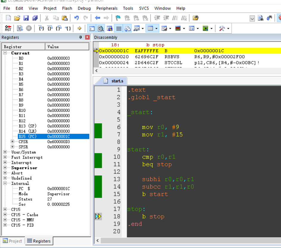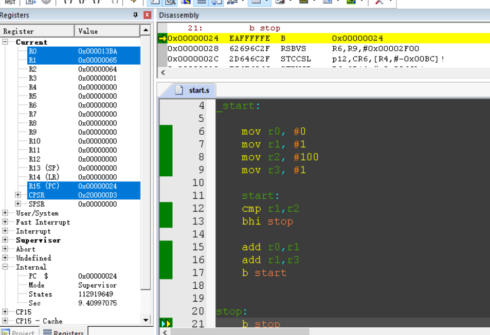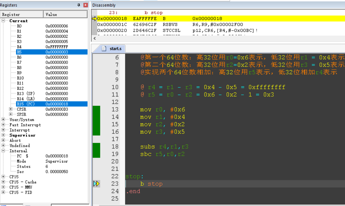 @实现两个64位数相加:高32位用r5表示,低32位相加r4表示