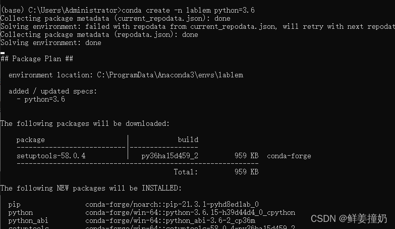 再输入conda create -n 名字 python=3.6,加了个“=”就成功了