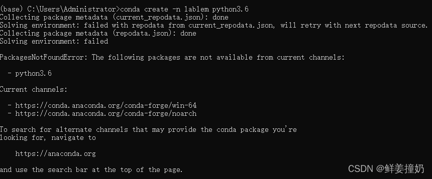 创建环境输入conda create -n 名字 python3.6,出现通道不匹配的错误,之前未出现过