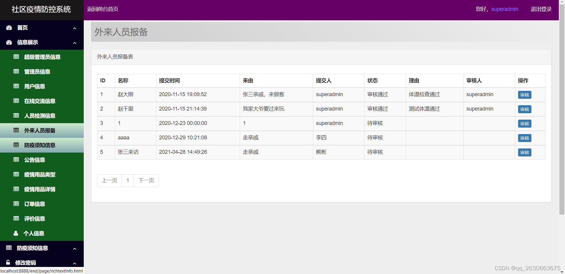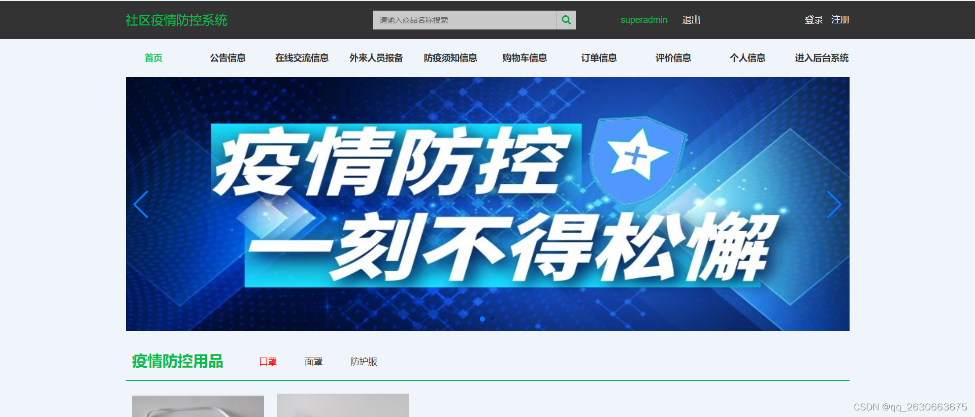 社区疫情防控管理系统,主要的模块包括用户管理,在线交流信息,人员检测信息,外来人员报备,防疫须知信息,公告信息,疫情用品信息,订单信息,评价信息功能。系统中管理员主要是为了安全有效地存储和管理各类信息,还可以对系统进行管理与更新维护等操作,并且对后台有相应的操作权限。