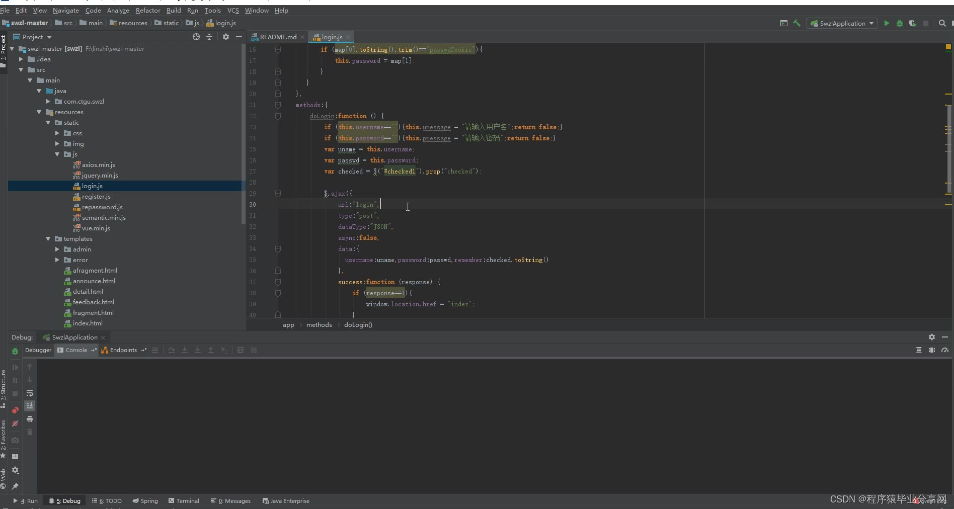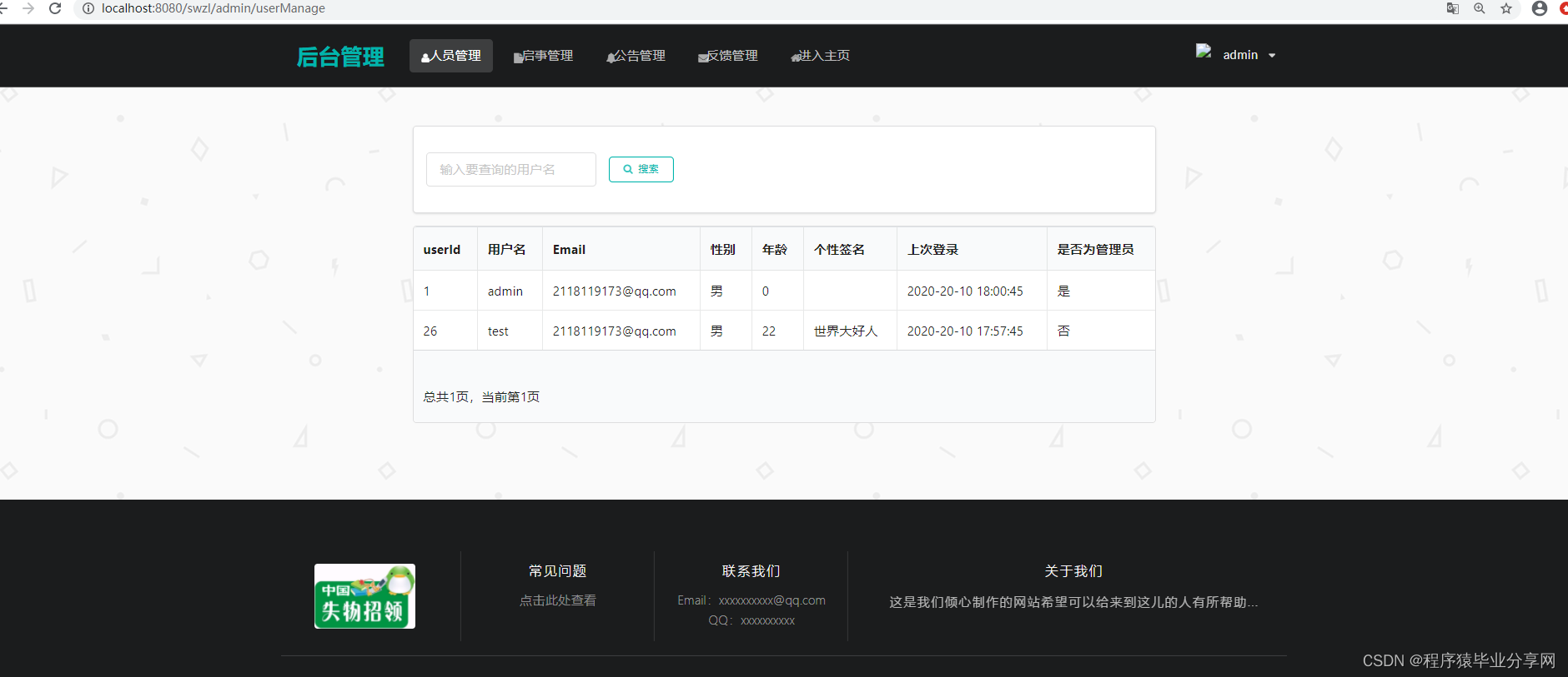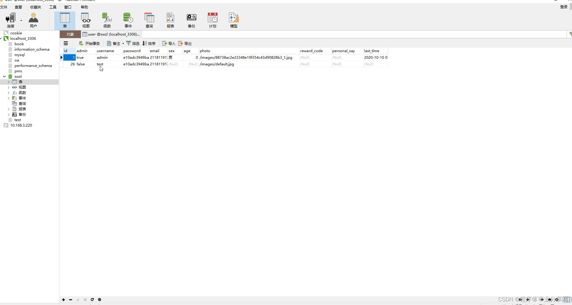http://localhost:8080/swzl/login 登录页 用户表user admin字段为true是管理员 false用户
