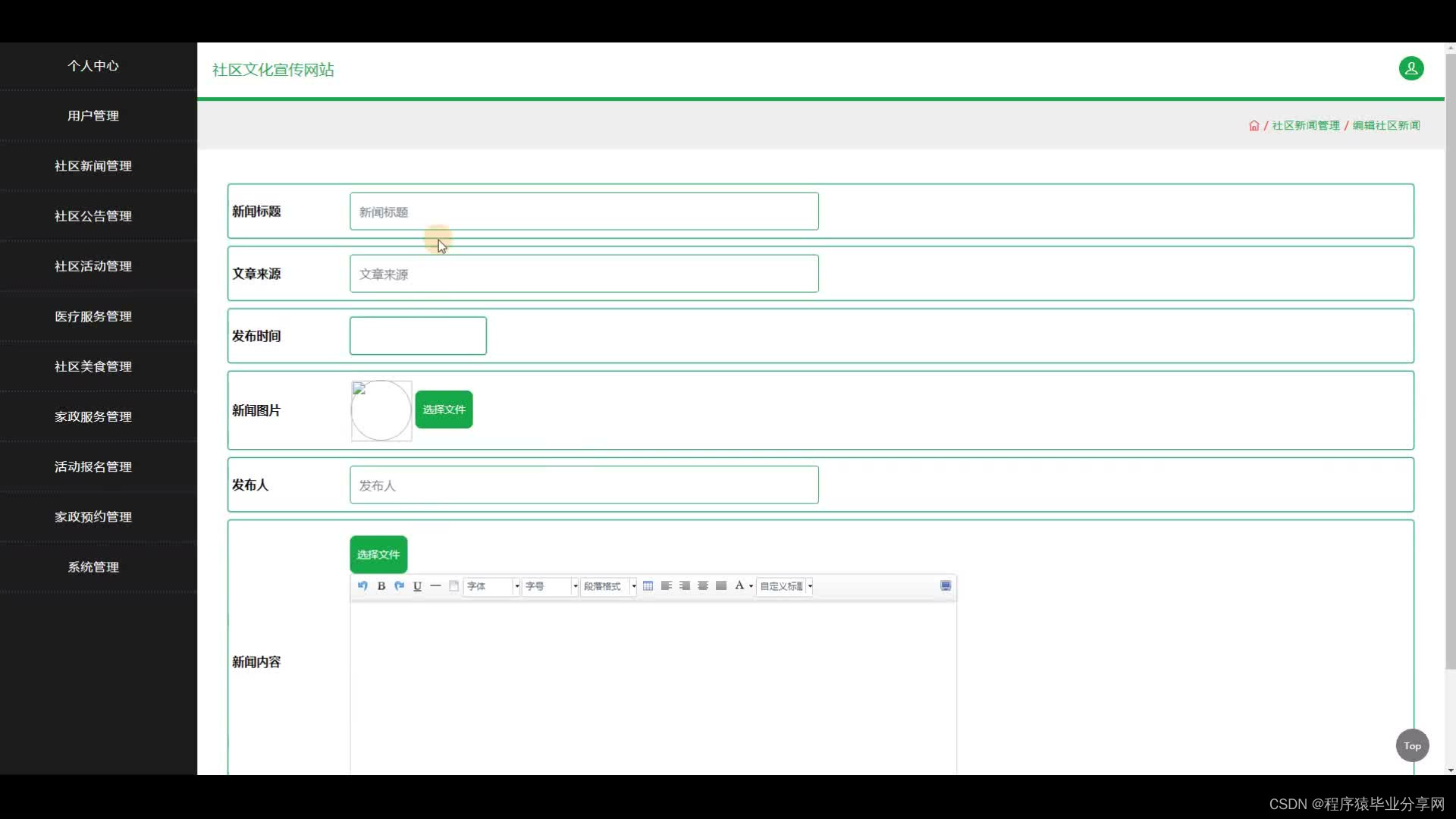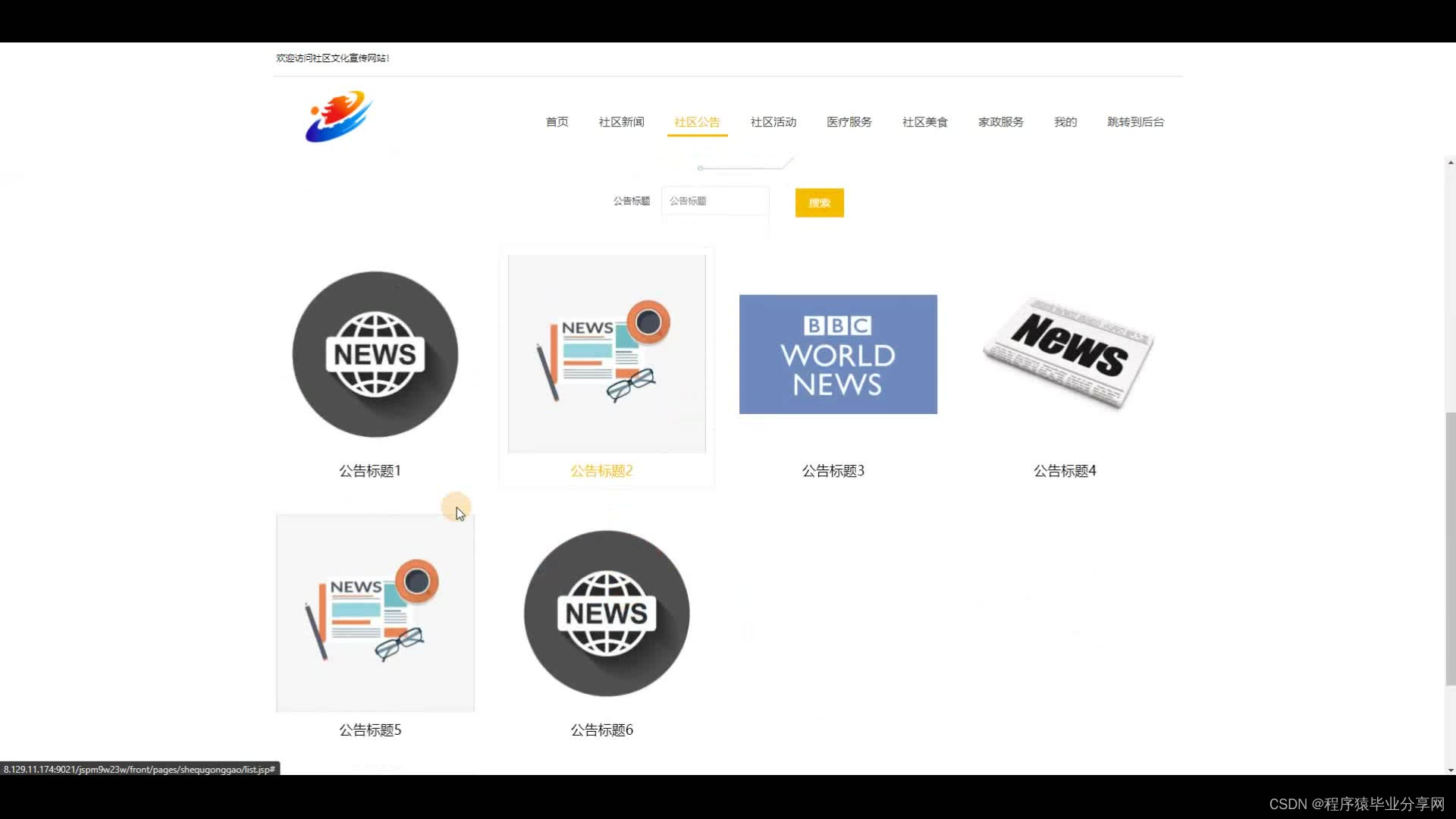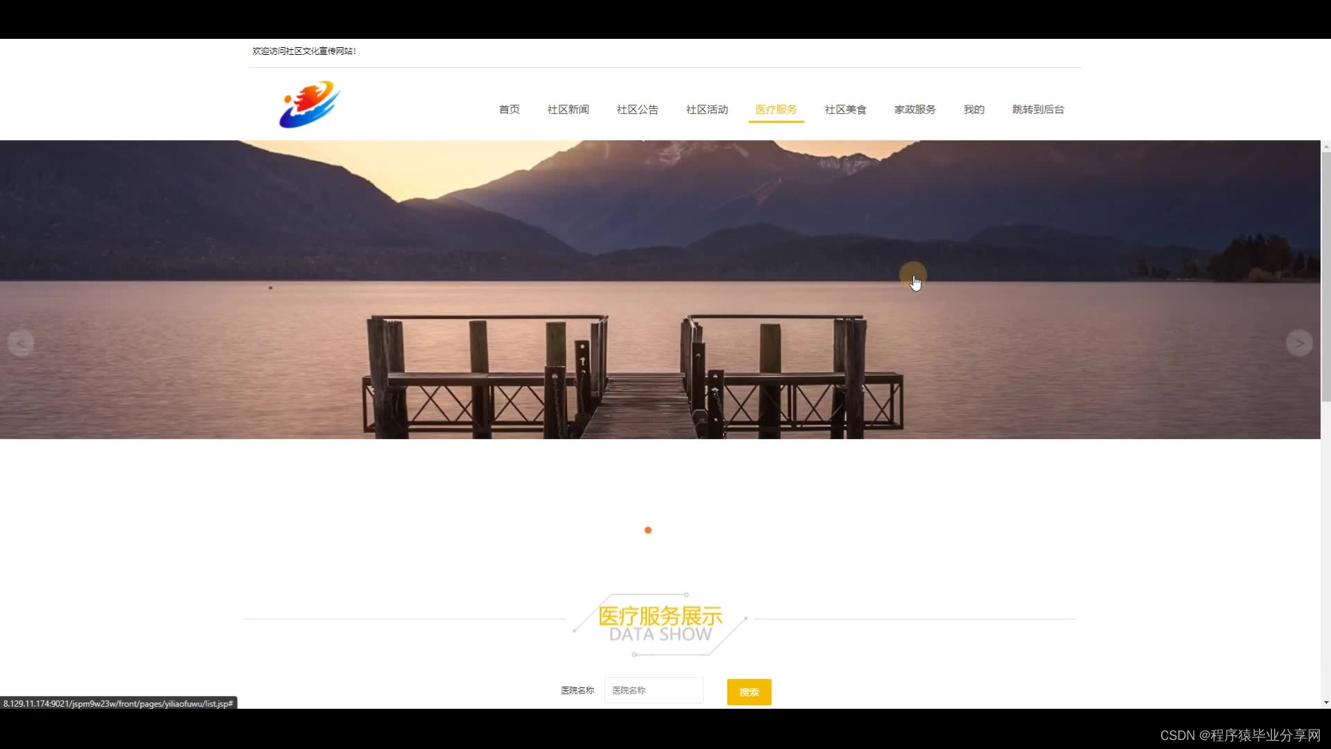 本社区文化宣传网站,主要服务的用户是社区附近的居民,为居民展示最新的新闻公告,社区活动,社区医疗服务,社区美食和社区家政服务等内容。具体的功能如下: