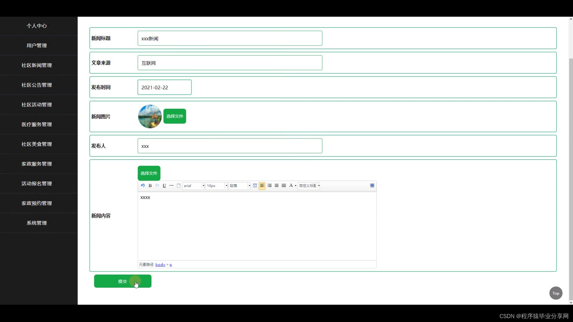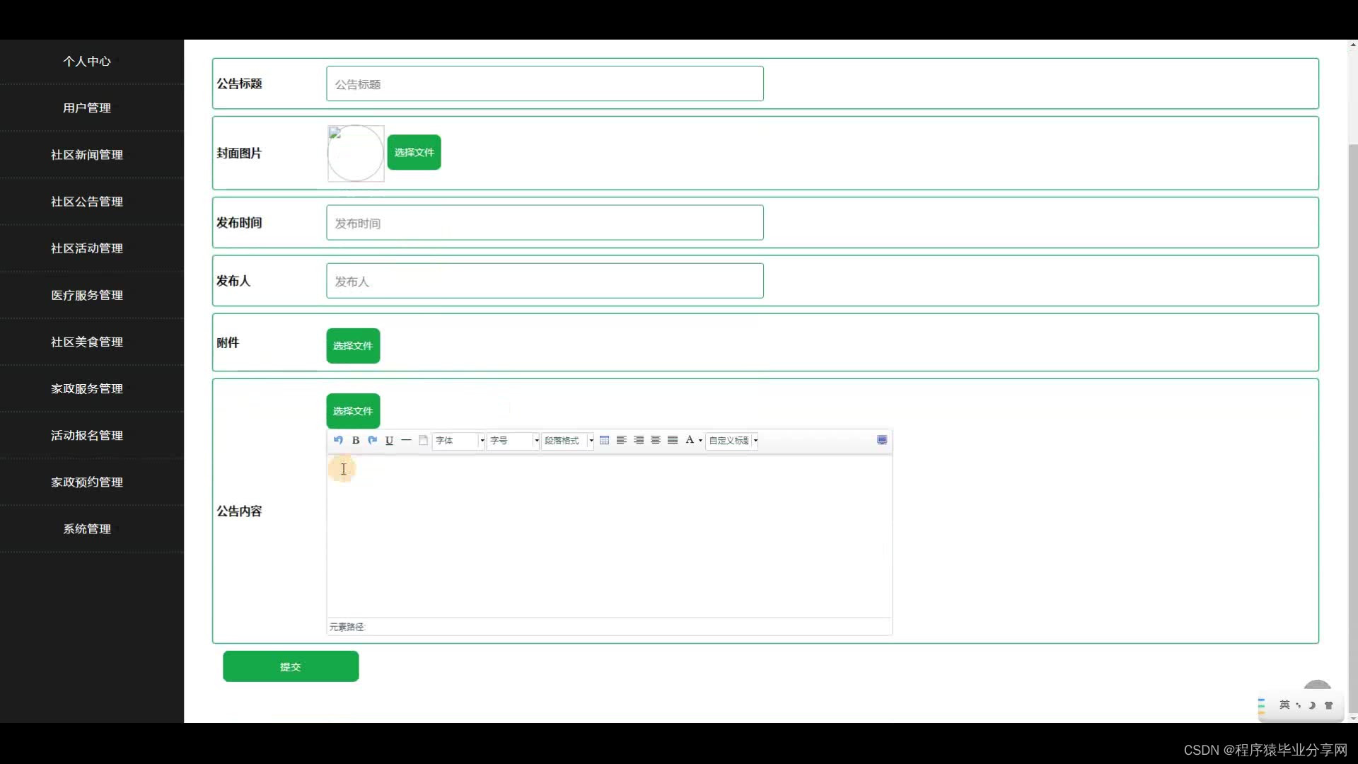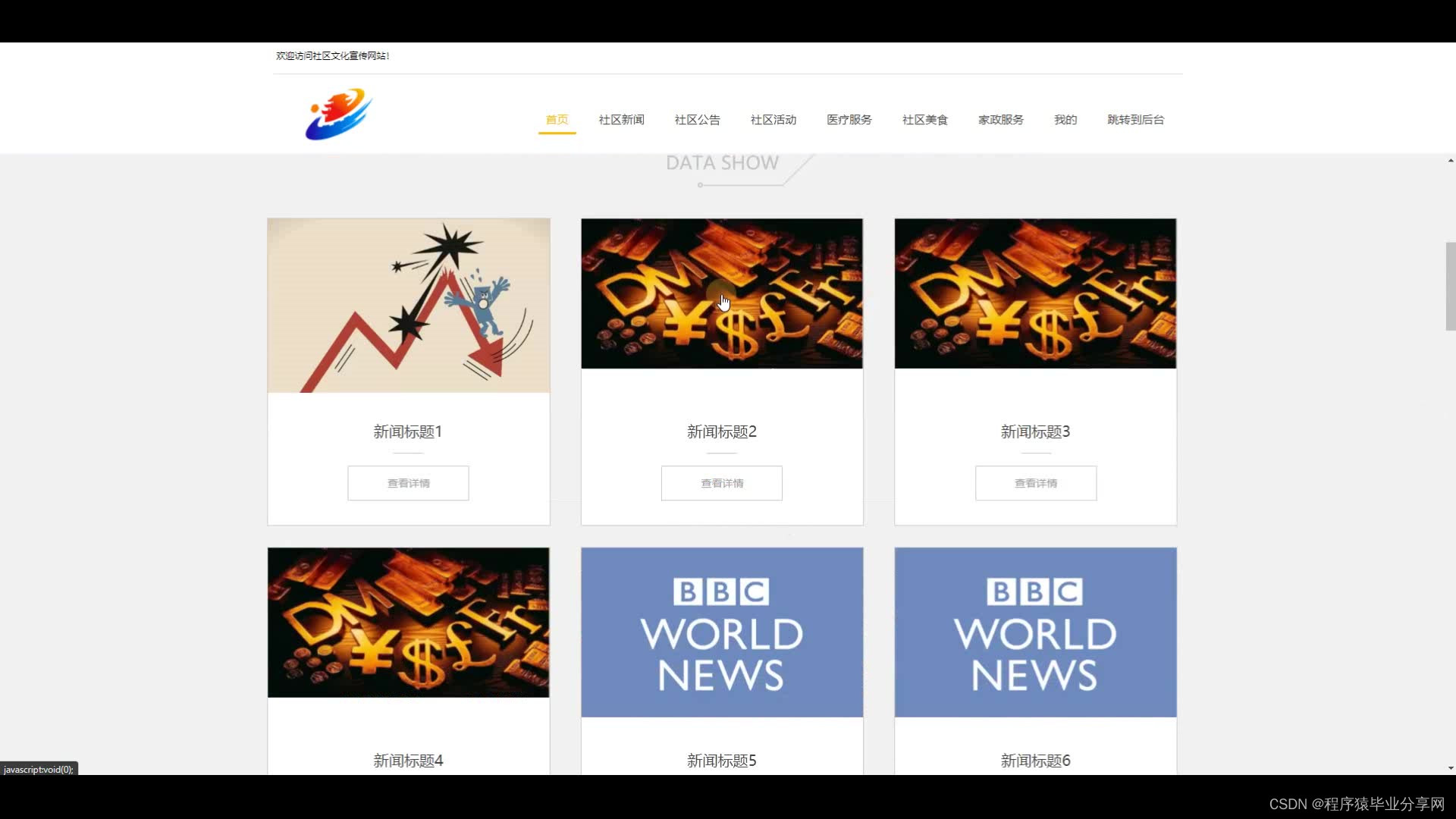 本社区文化宣传网站,主要服务的用户是社区附近的居民,为居民展示最新的新闻公告,社区活动,社区医疗服务,社区美食和社区家政服务等内容。具体的功能如下: