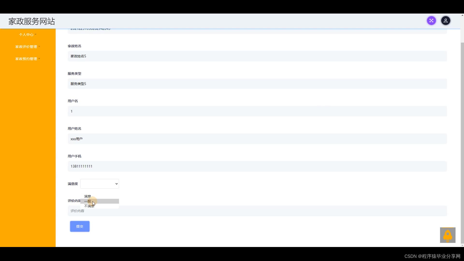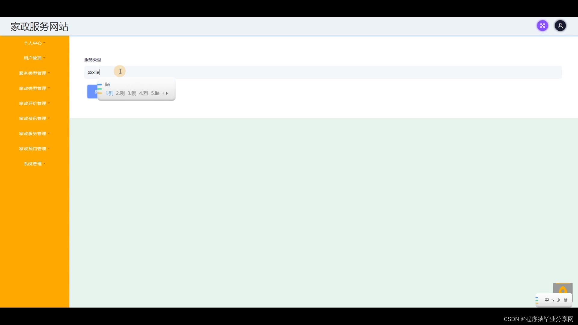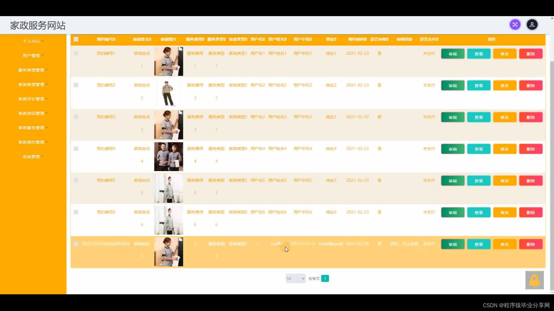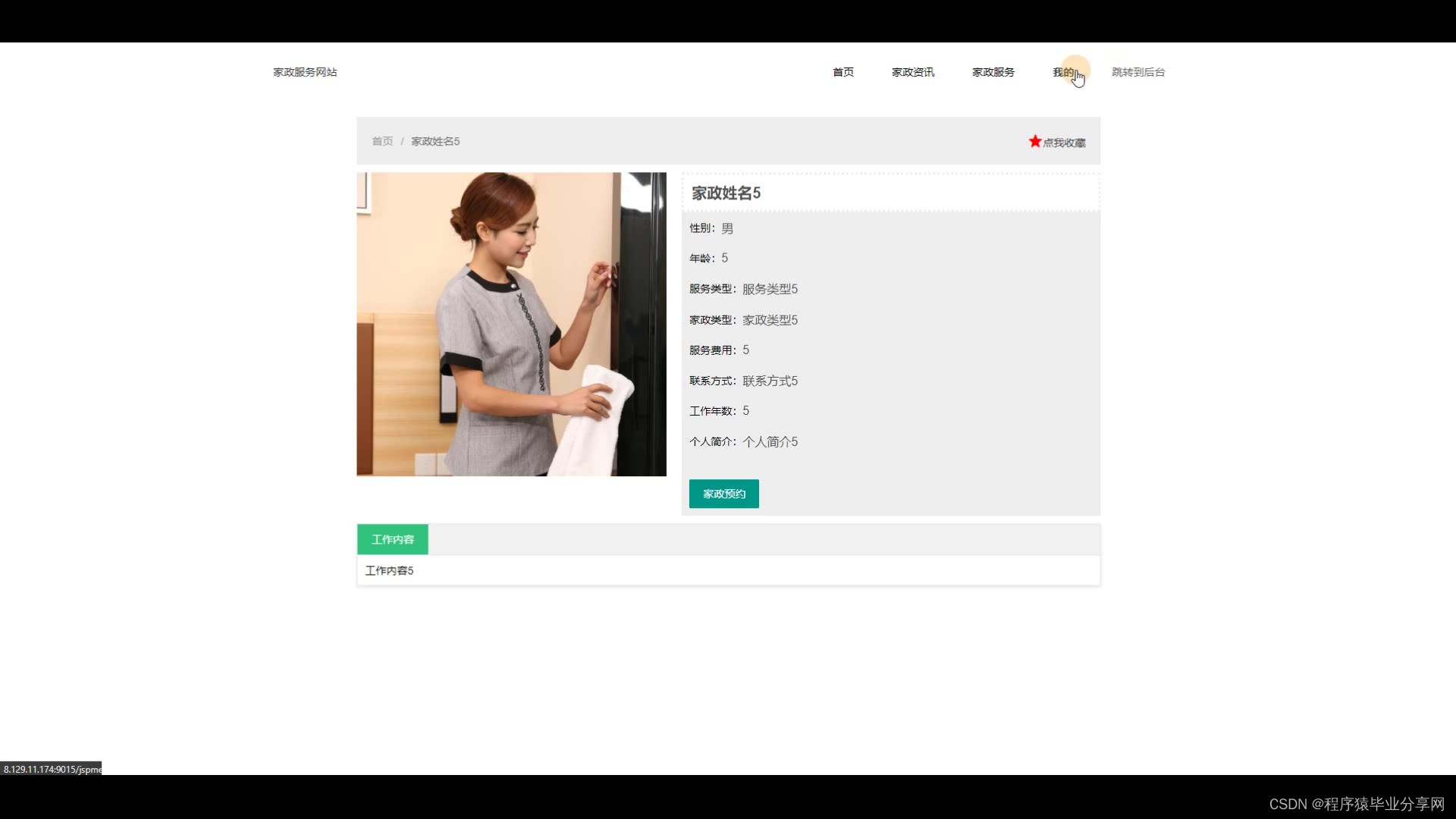 家政服务网站,主要的模块包括查看管理员;个人中心、用户管理、服务类型管理、家政类型管理、家政评价管理、家政资讯管理、家政服务管理、家政预约管理、系统管理,用户;个人中心、家政评价管理、家政预约管理、前台首页;首页、家政资讯、家政服务、我的、跳转到后台等功能。系统中管理员主要是为了安全有效地存储和管理各类信息,还可以对系统进行管理与更新维护等操作,并且对后台有相应的操作权限。