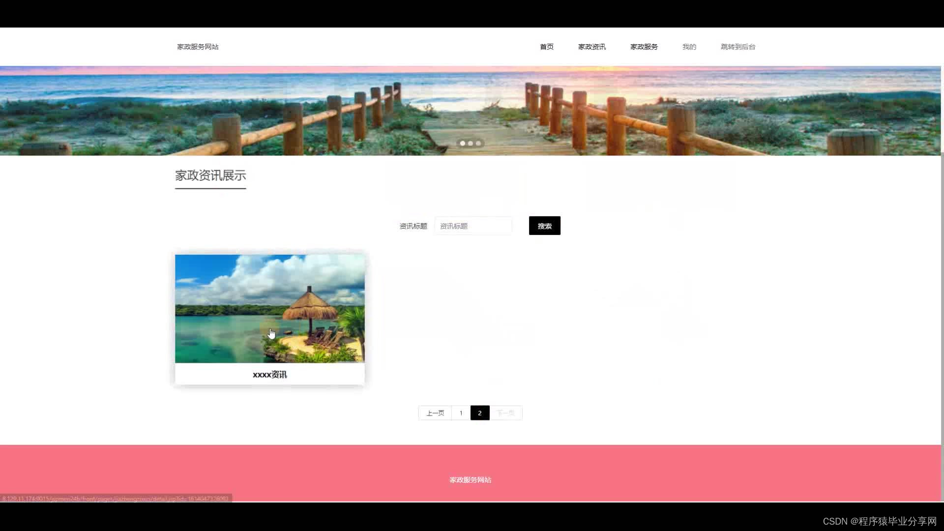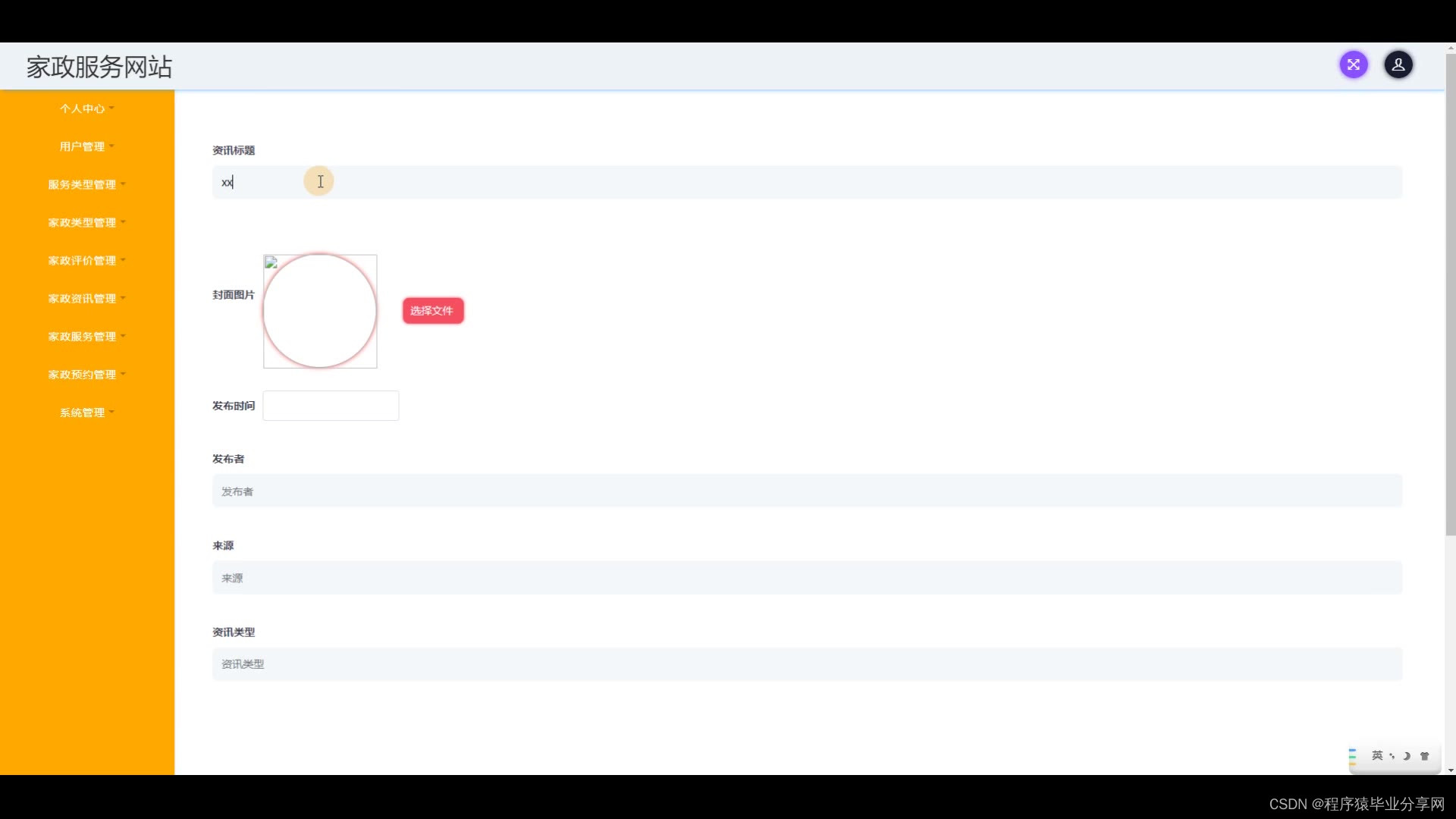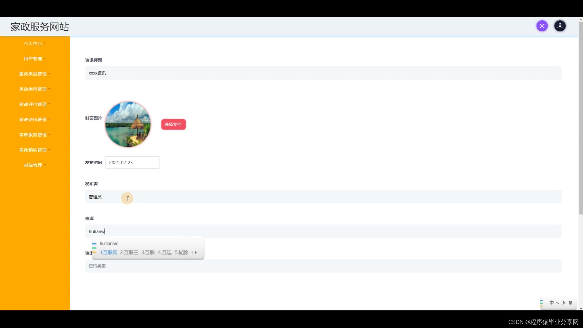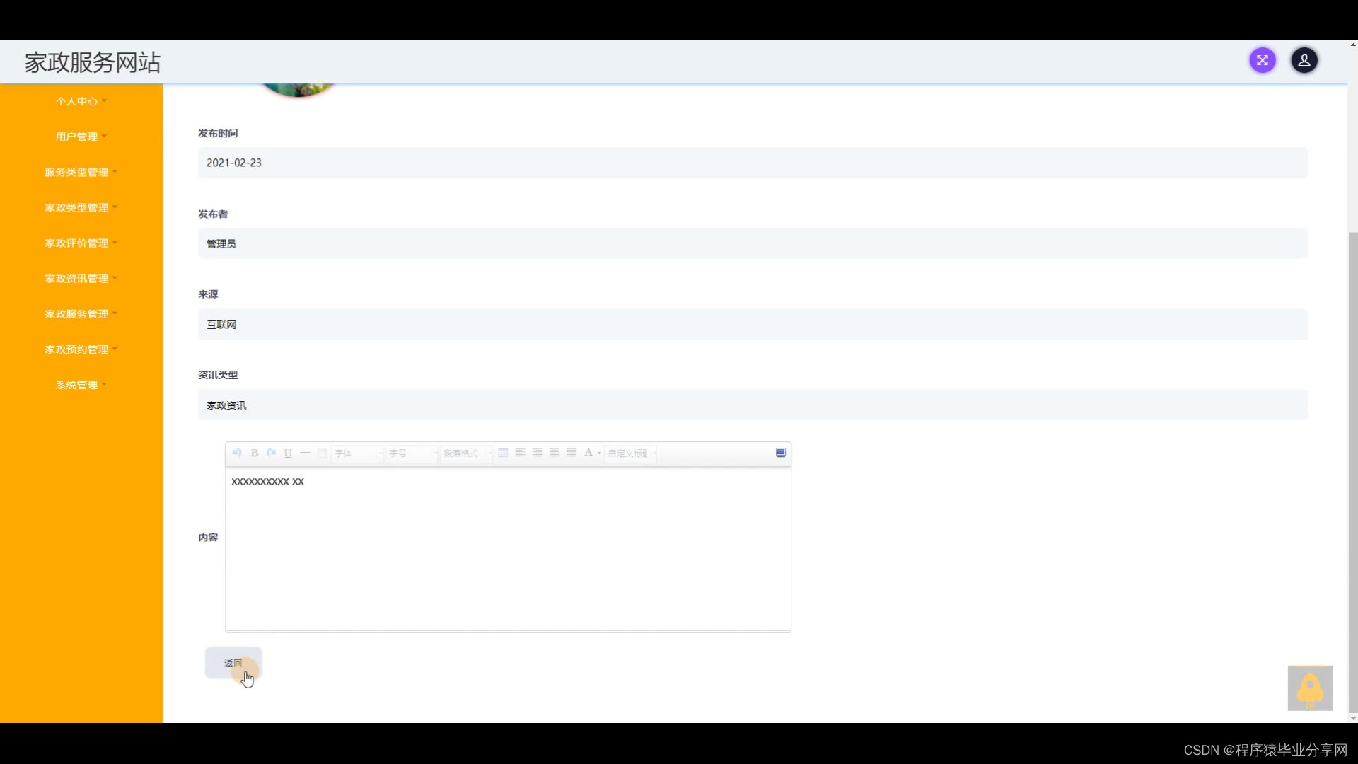 家政服务网站,主要的模块包括查看管理员;个人中心、用户管理、服务类型管理、家政类型管理、家政评价管理、家政资讯管理、家政服务管理、家政预约管理、系统管理,用户;个人中心、家政评价管理、家政预约管理、前台首页;首页、家政资讯、家政服务、我的、跳转到后台等功能。系统中管理员主要是为了安全有效地存储和管理各类信息,还可以对系统进行管理与更新维护等操作,并且对后台有相应的操作权限。