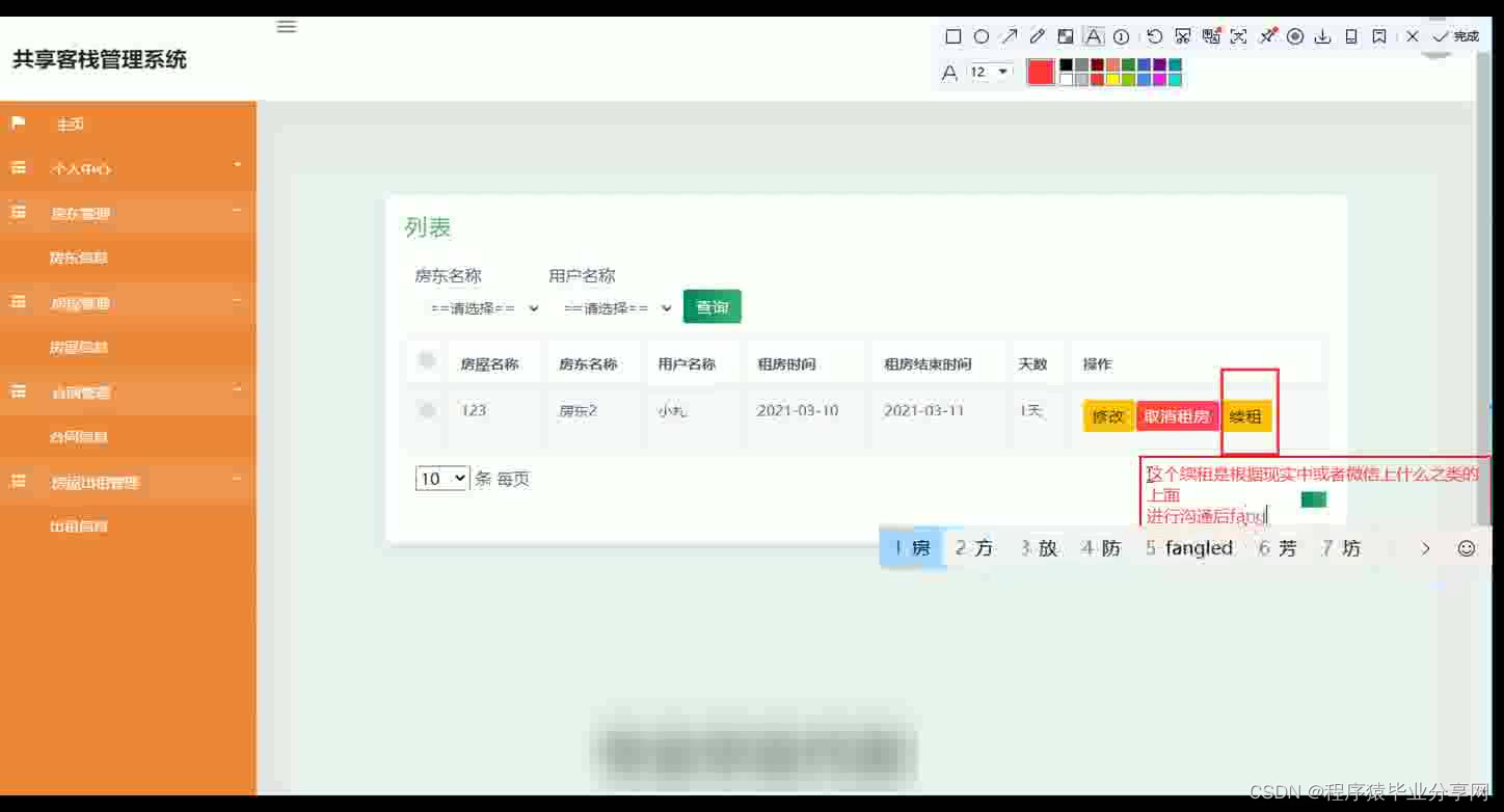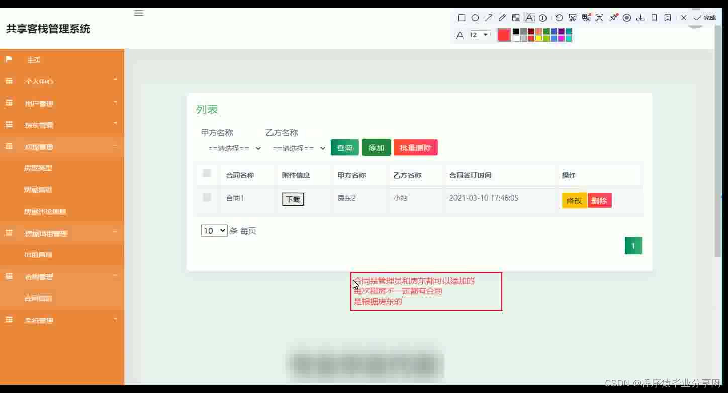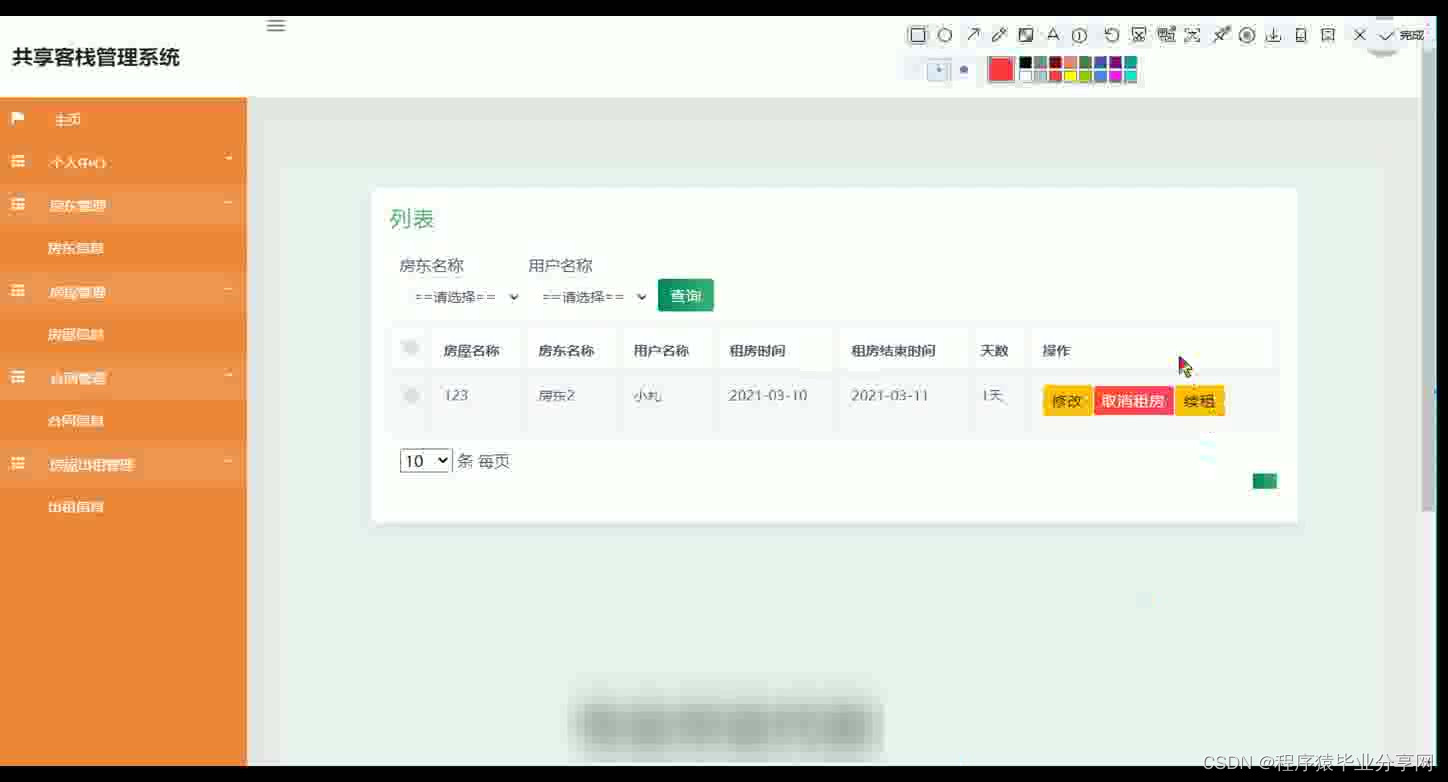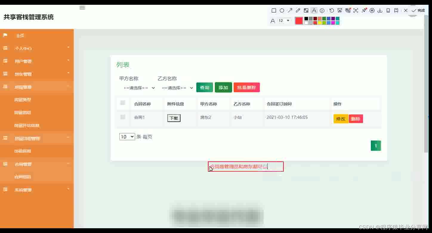 共享客栈管理系统在Eclipse环境中,使用Java语言进行编码,使用Mysql创建数据表保存本系统产生的数据。系统可以提供信息显示和相应服务,本系统实现房屋管理,合同文件上传与下载,房屋租房与续租,房屋出租管理等功能。