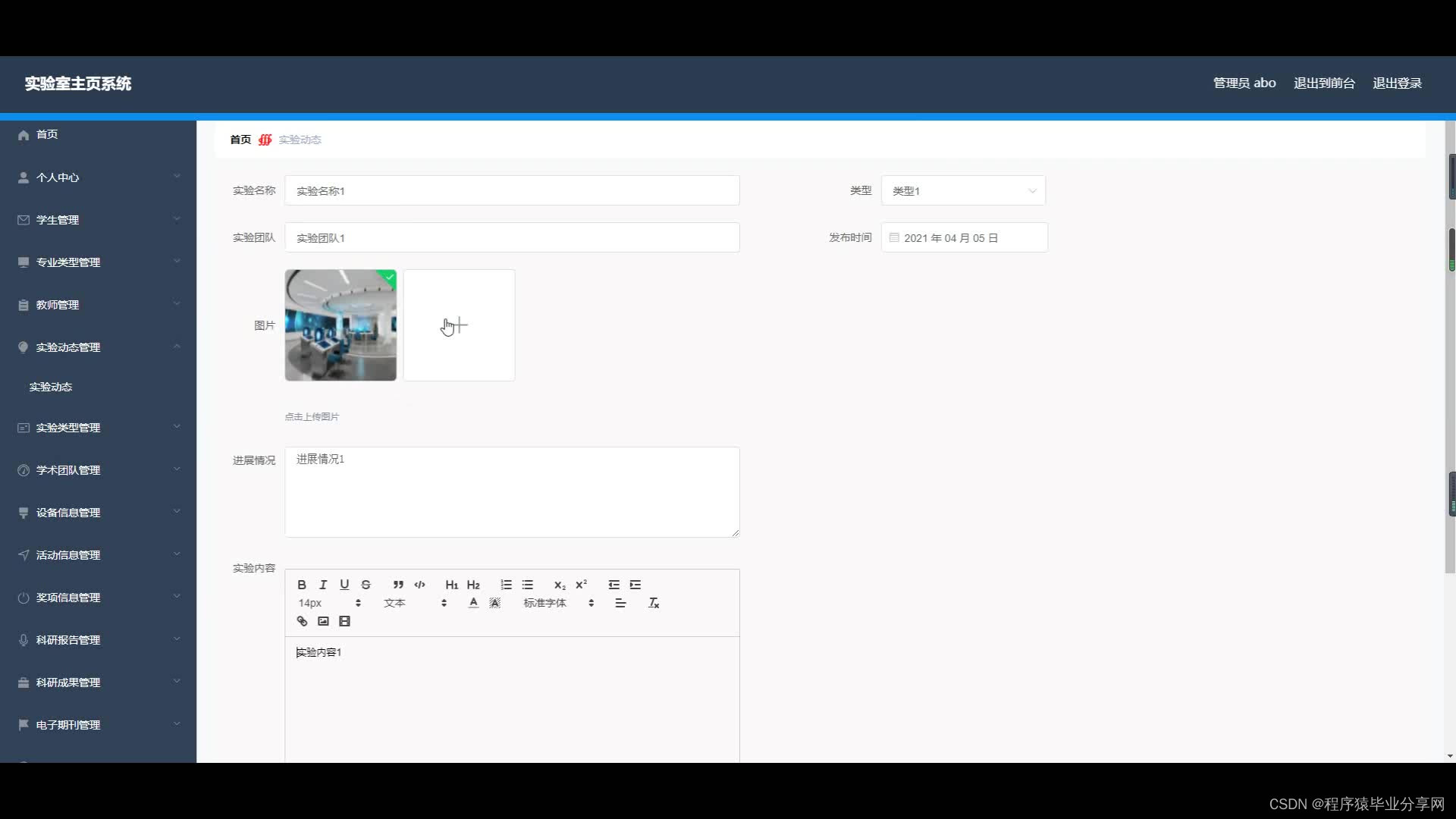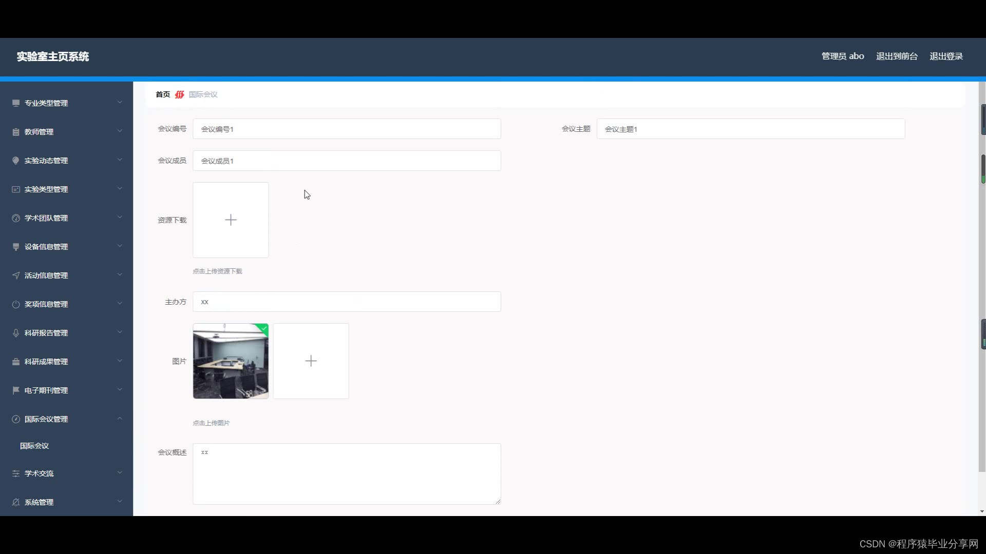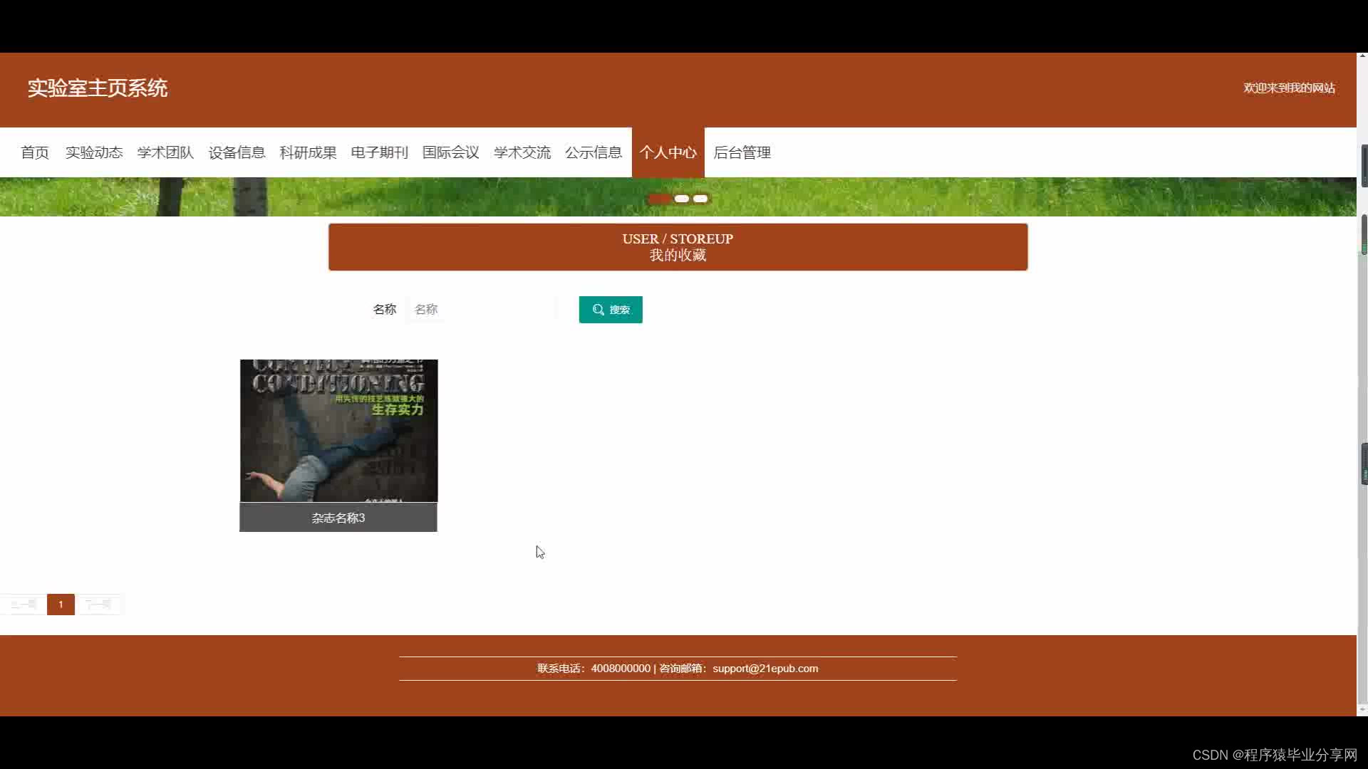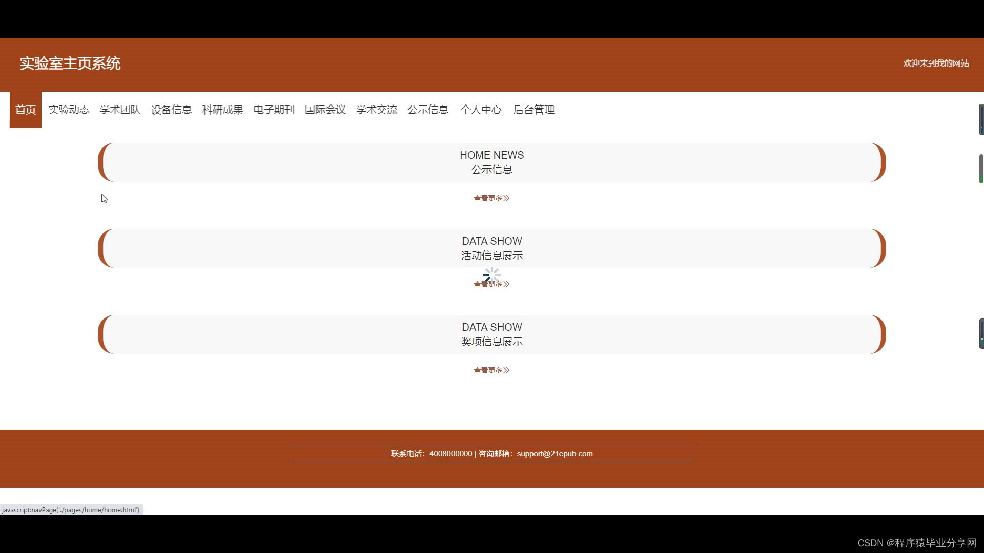 智慧城市实验室主页系统在Eclipse环境中,使用Java语言进行编码,使用Mysql创建数据表保存本系统产生的数据。系统可以提供信息显示和相应服务,本系统管理员管理电子期刊,国际会议,学术团队以及实验动态,管理奖项和活动以及设备信息。教师管理科研报告,管理科研成果,下载国际会议资源,参与学术交流。学生下载科研成果,会议资源,电子期刊文件,查看学术交流里面的帖子并发布评论,查看学术团队,实验动态等信息。