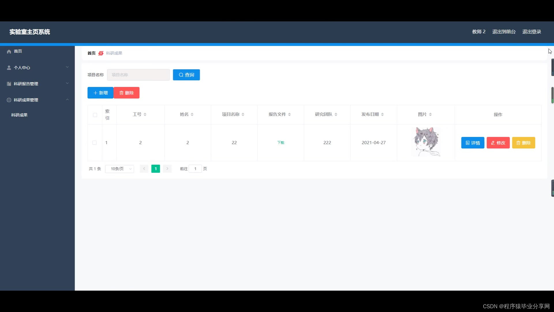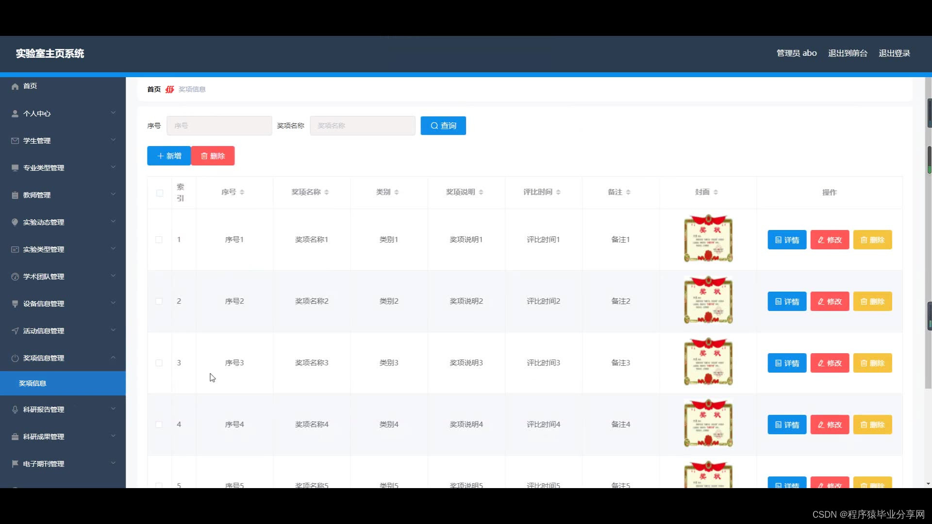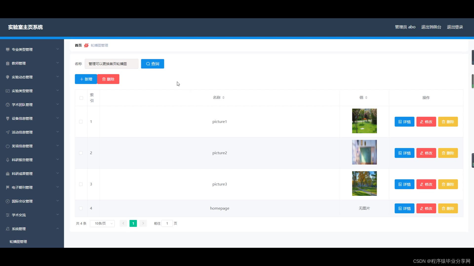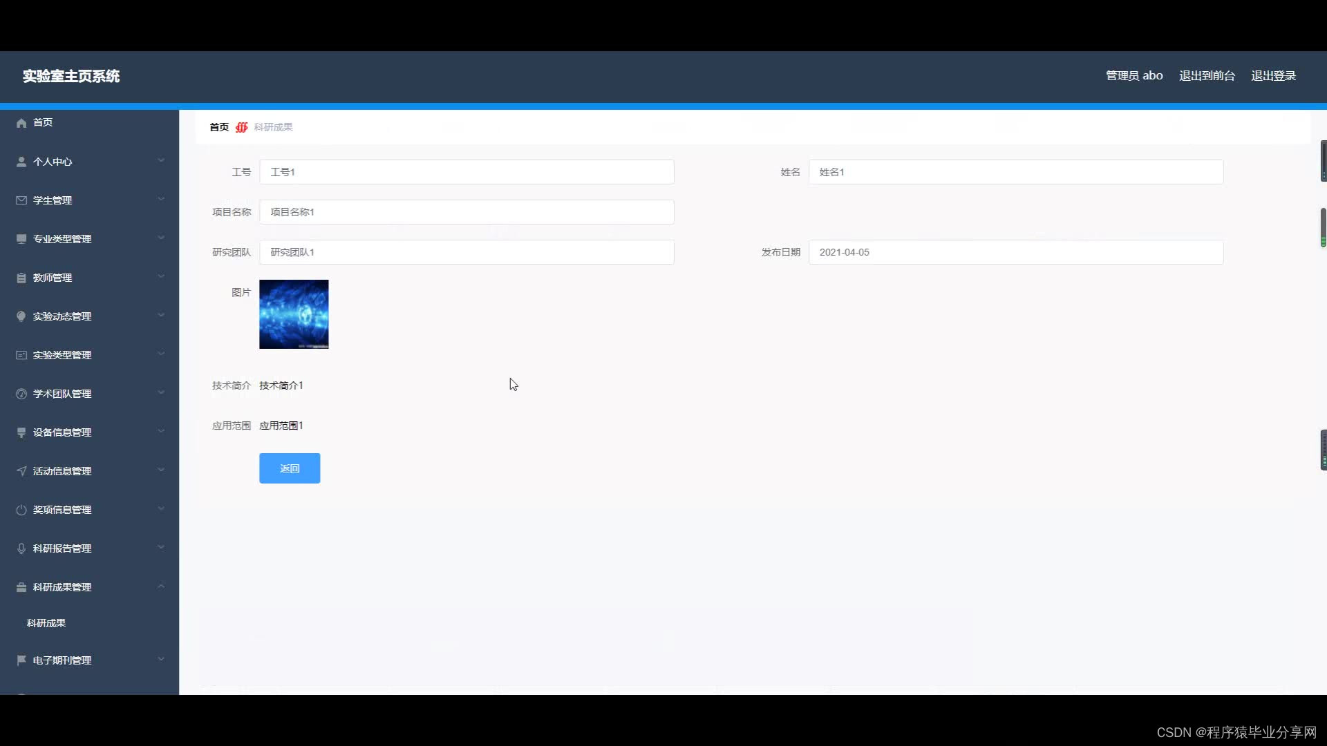 智慧城市实验室主页系统在Eclipse环境中,使用Java语言进行编码,使用Mysql创建数据表保存本系统产生的数据。系统可以提供信息显示和相应服务,本系统管理员管理电子期刊,国际会议,学术团队以及实验动态,管理奖项和活动以及设备信息。教师管理科研报告,管理科研成果,下载国际会议资源,参与学术交流。学生下载科研成果,会议资源,电子期刊文件,查看学术交流里面的帖子并发布评论,查看学术团队,实验动态等信息。