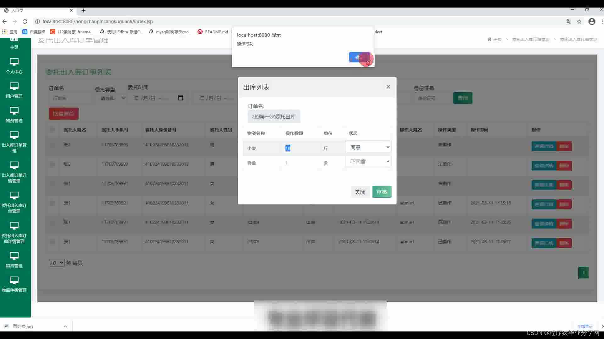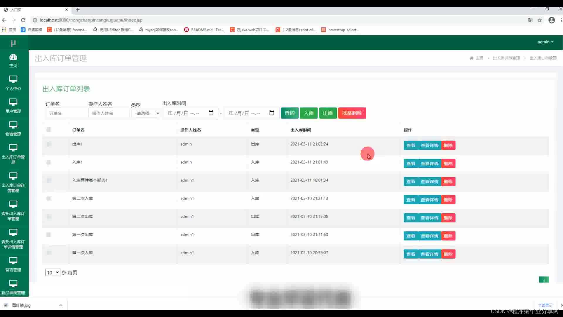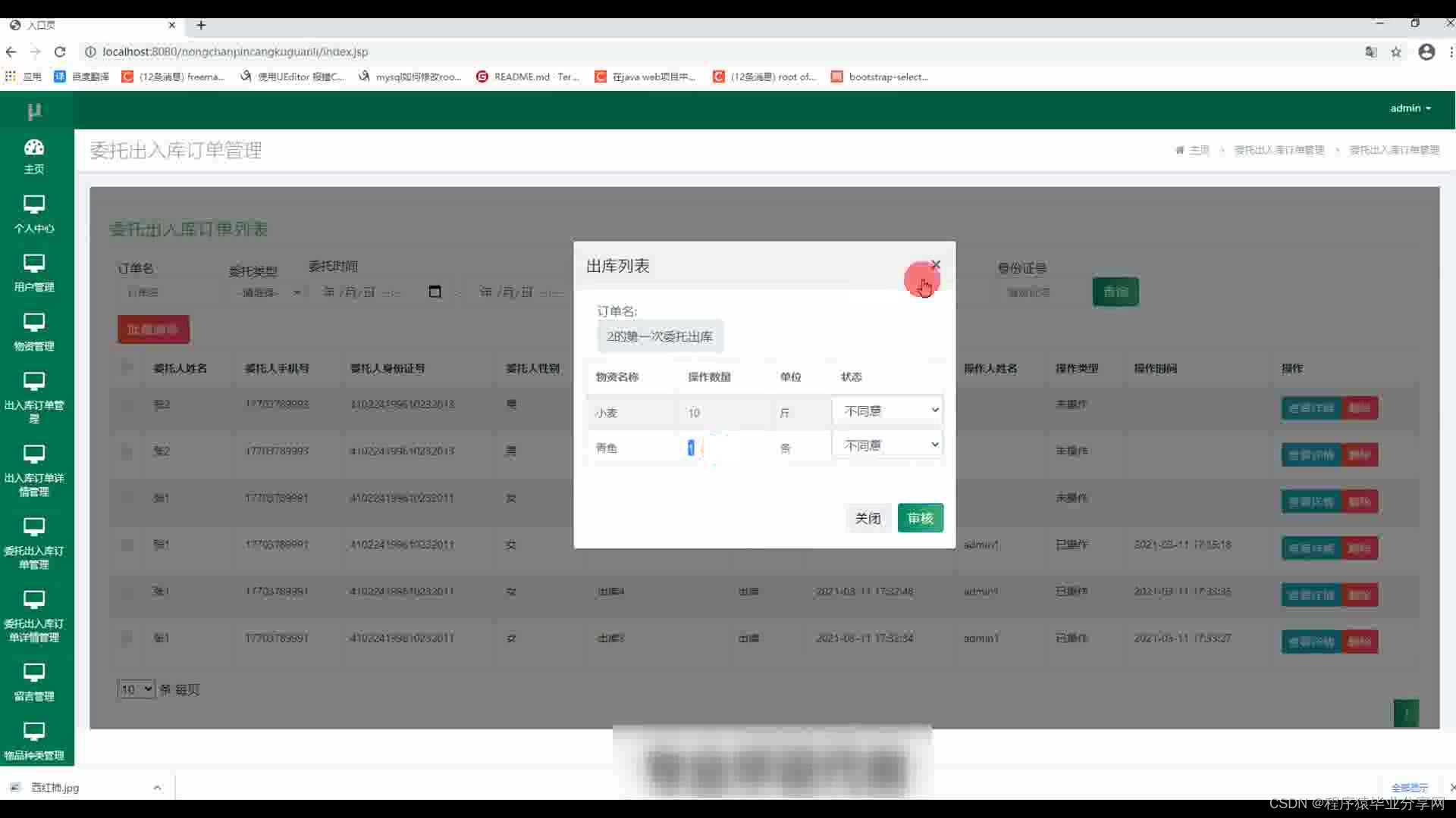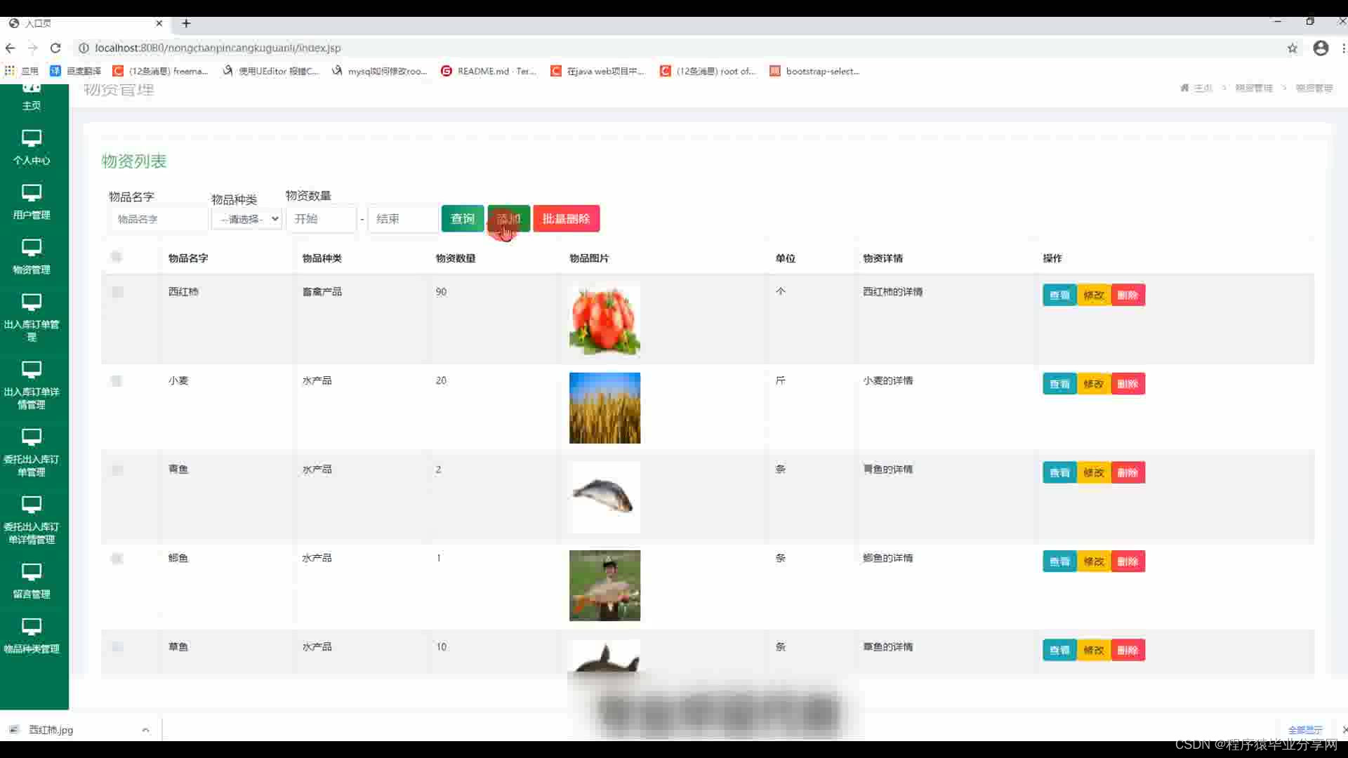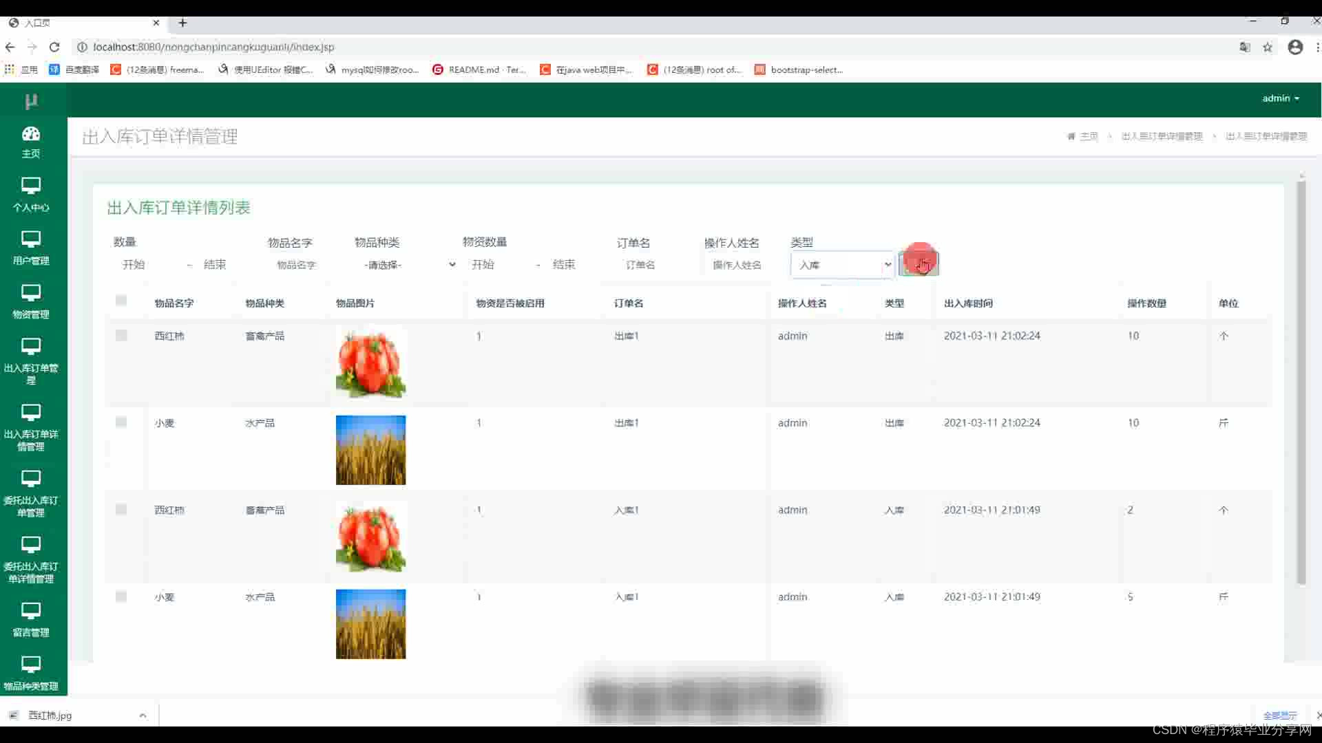 运用Java和MySQL等技术搭建完成本次的农产品仓库管理系统。农产品仓库管理系统是一个专门用来管理包括粮食、水果、蔬菜、 肉类、蛋类五种农产品的系统。该软件为“农产品仓库管理系统”此软件的开发是针对某些企业及公司仓库货物管理的繁琐操作。此系统按照不同的角色,系统可以分为两大部分用户和管理员。用户,该操作要求用户名和对应的密码才能进入系统执行相应的操作。管理员,该操作要求管理员名和对应的密码才能进入系统执行相应权限的操作。