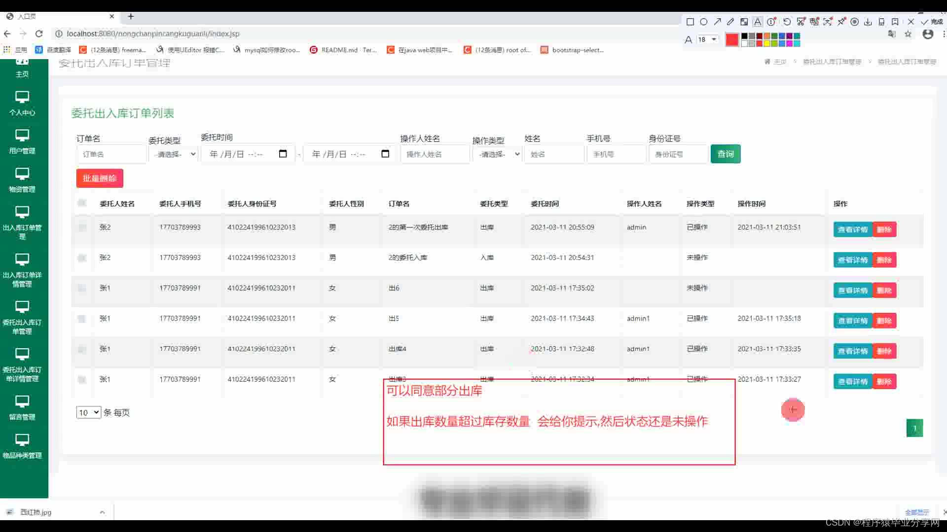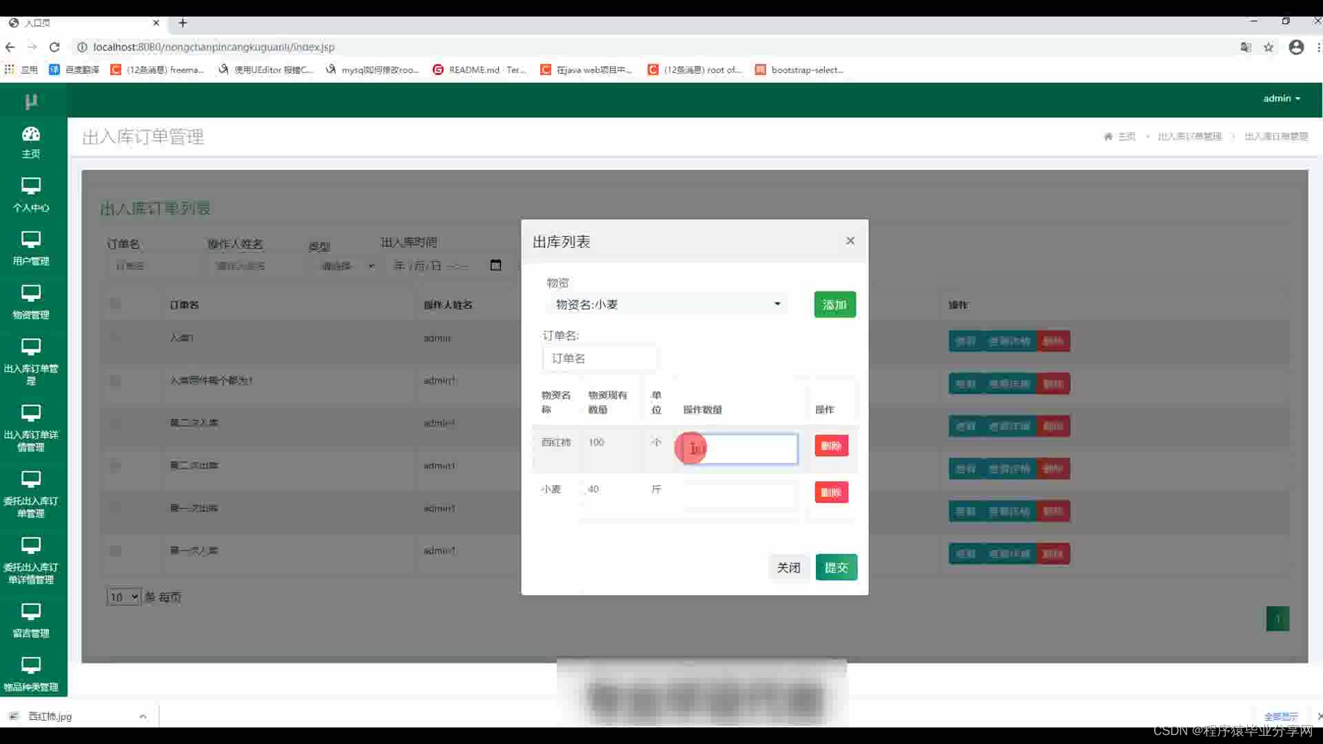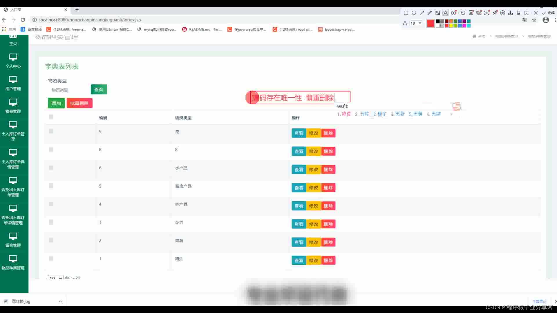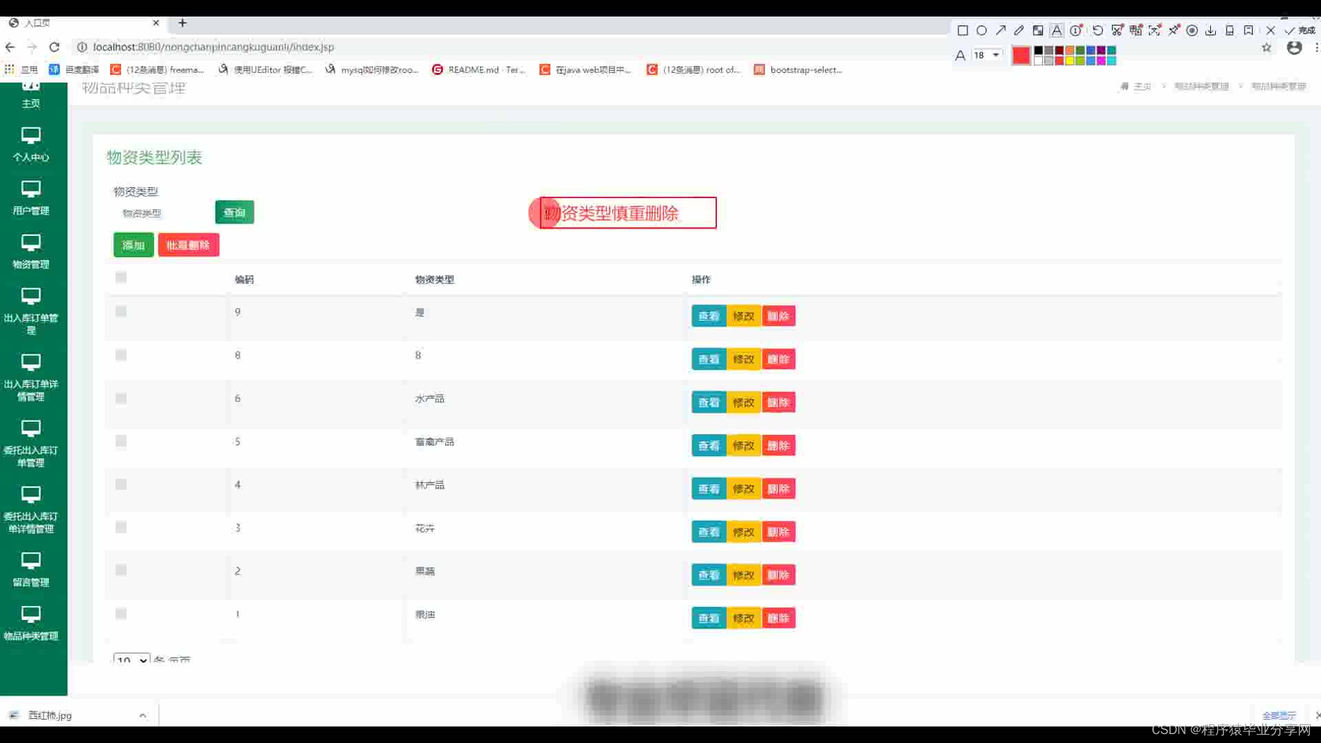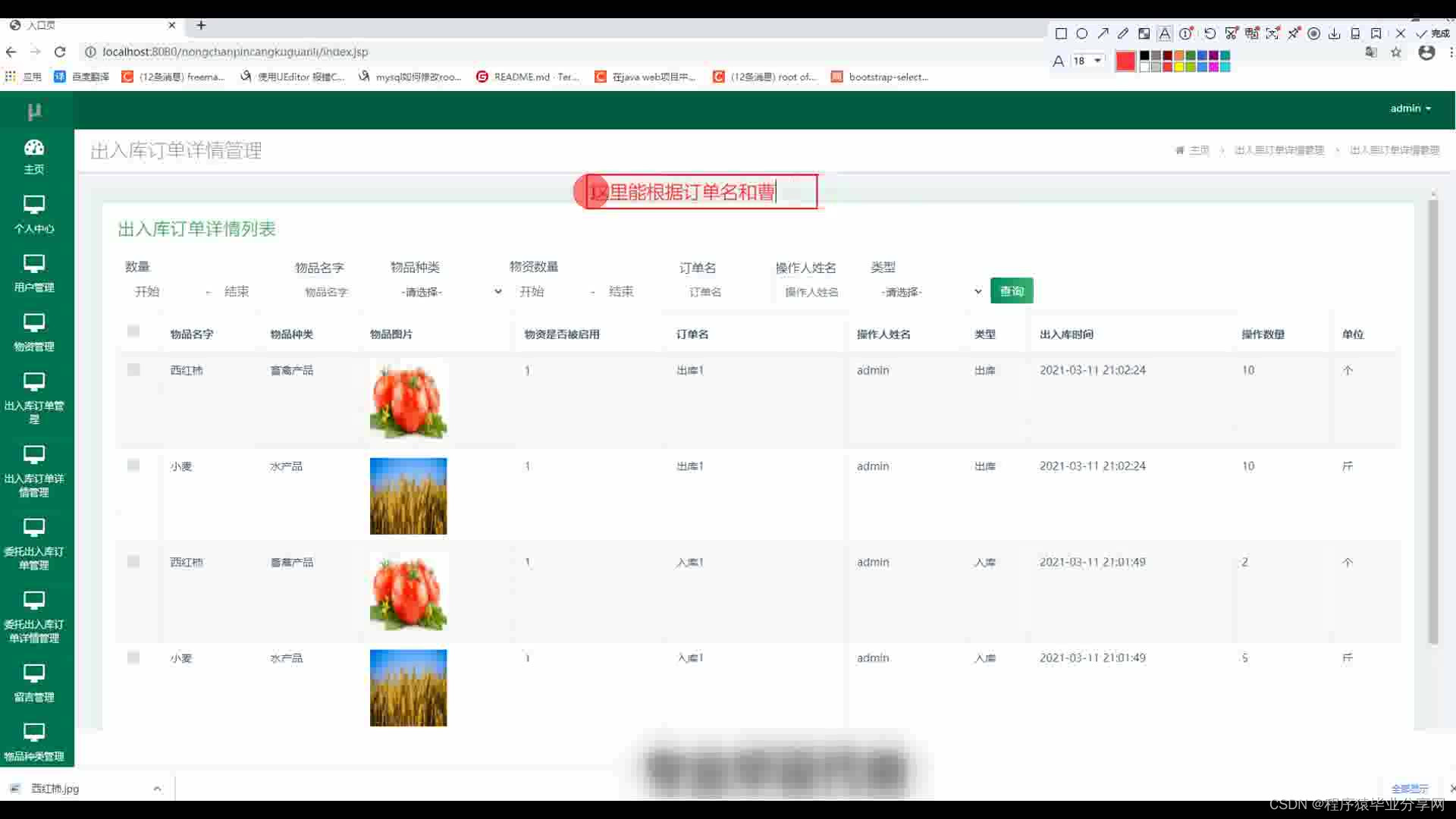 运用Java和MySQL等技术搭建完成本次的农产品仓库管理系统。农产品仓库管理系统是一个专门用来管理包括粮食、水果、蔬菜、 肉类、蛋类五种农产品的系统。该软件为“农产品仓库管理系统”此软件的开发是针对某些企业及公司仓库货物管理的繁琐操作。此系统按照不同的角色,系统可以分为两大部分用户和管理员。用户,该操作要求用户名和对应的密码才能进入系统执行相应的操作。管理员,该操作要求管理员名和对应的密码才能进入系统执行相应权限的操作。