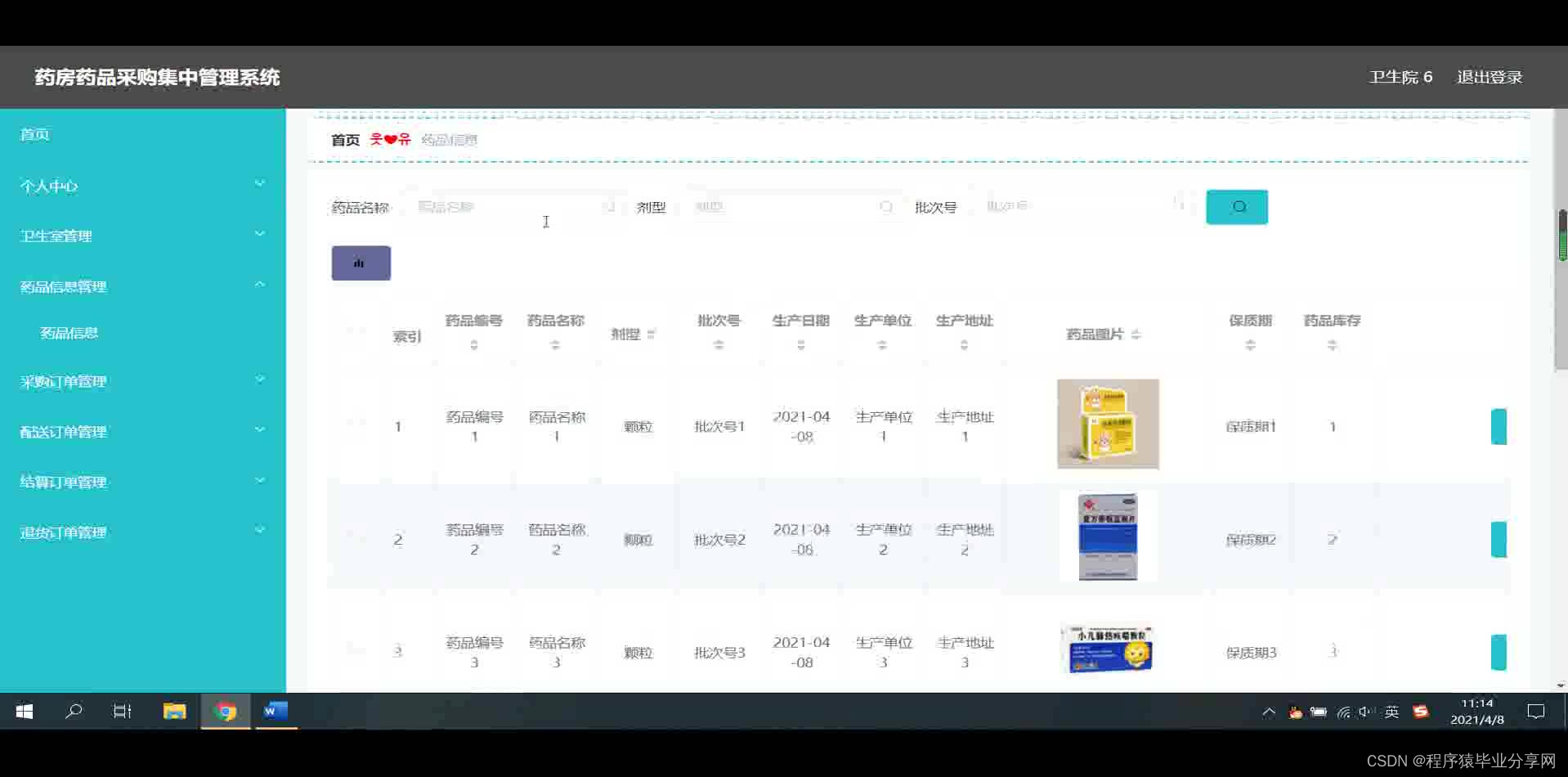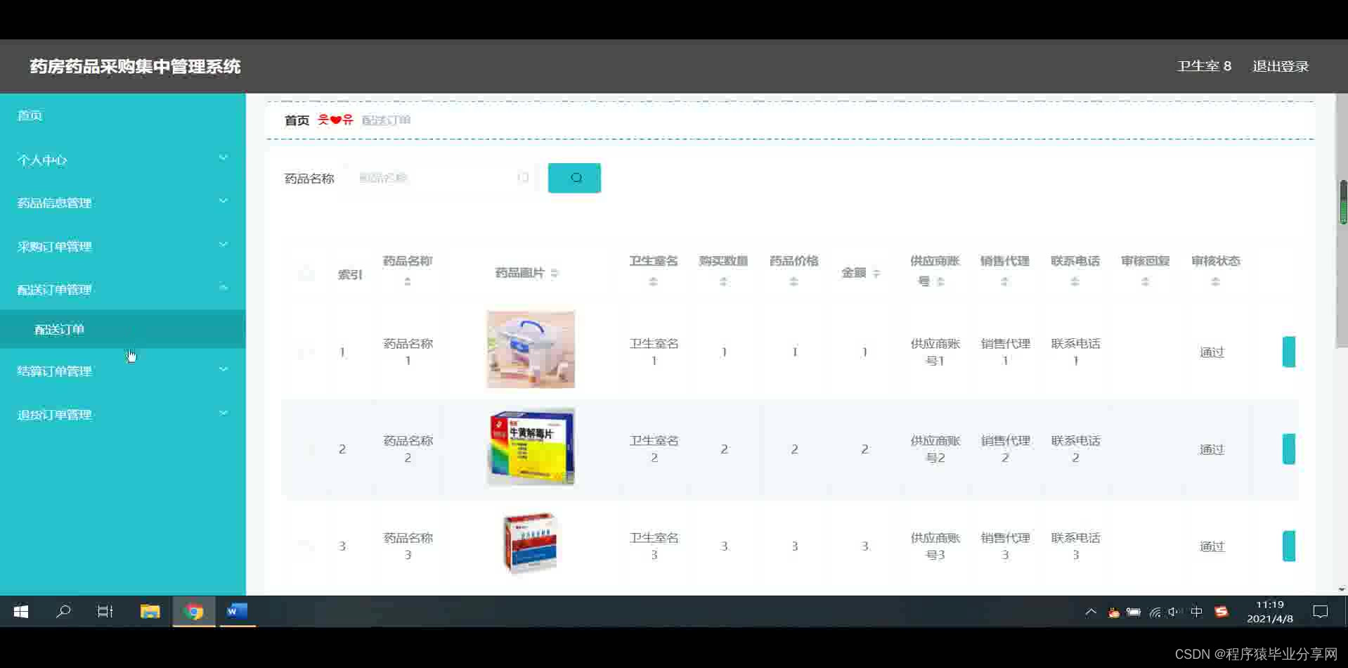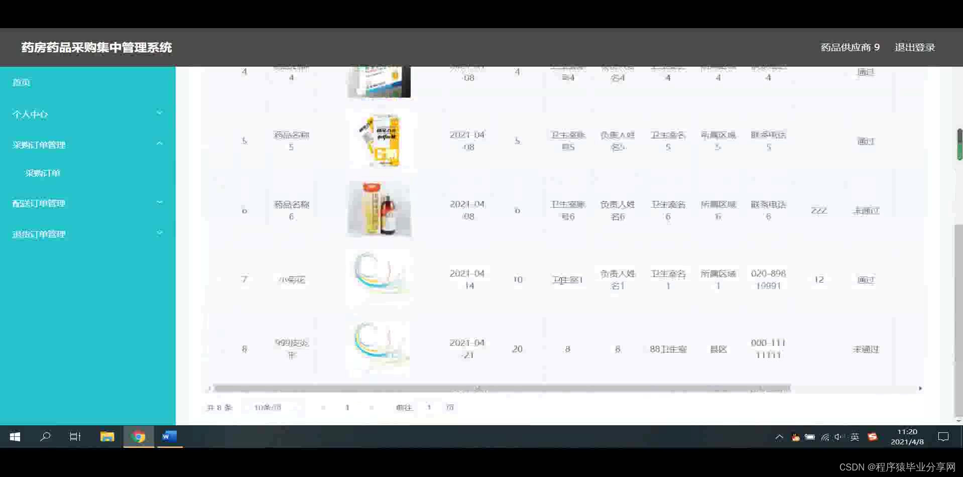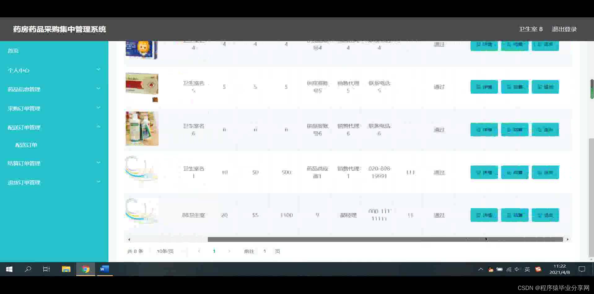 药房药品采购集中管理系统在Eclipse环境中,使用Java语言进行编码,使用Mysql创建数据表保存本系统产生的数据。系统可以提供信息显示和相应服务,系统可以实现采购订单管理,配送订单管理,结算订单管理,退货订单管理以及药品信息管理等功能。