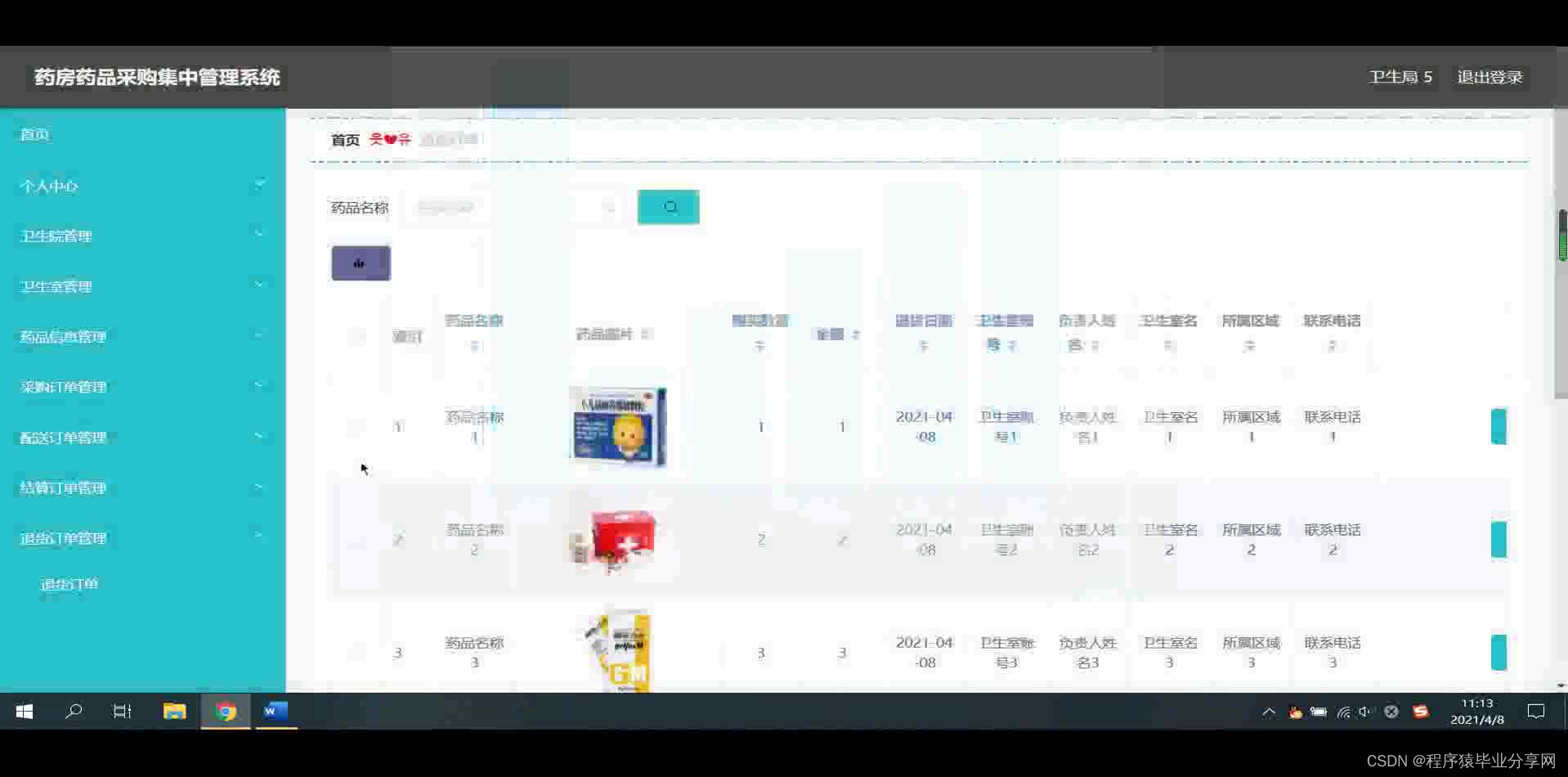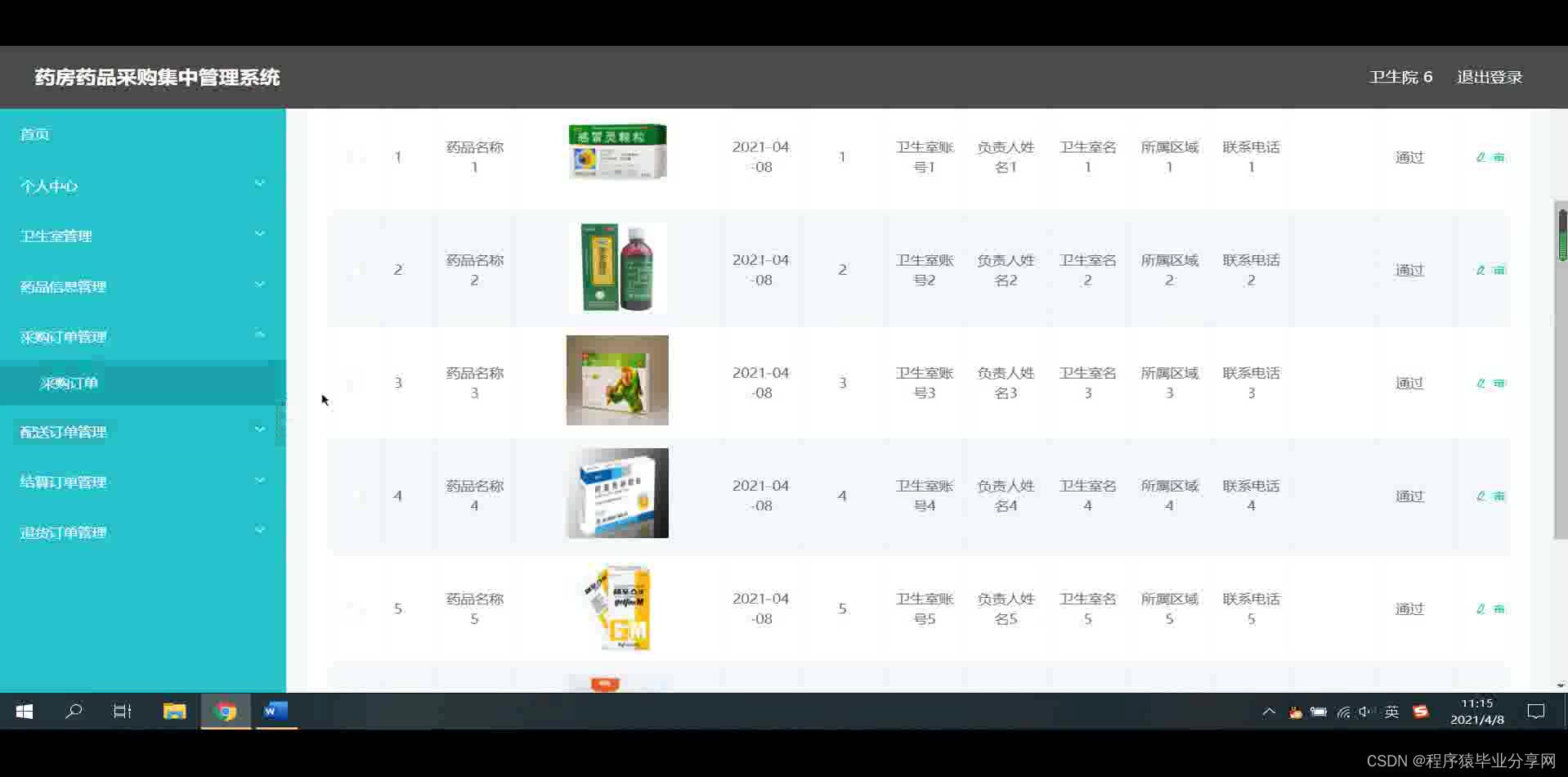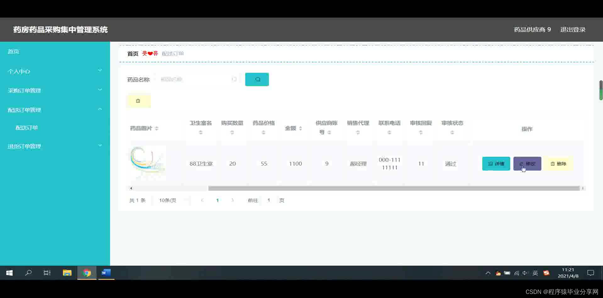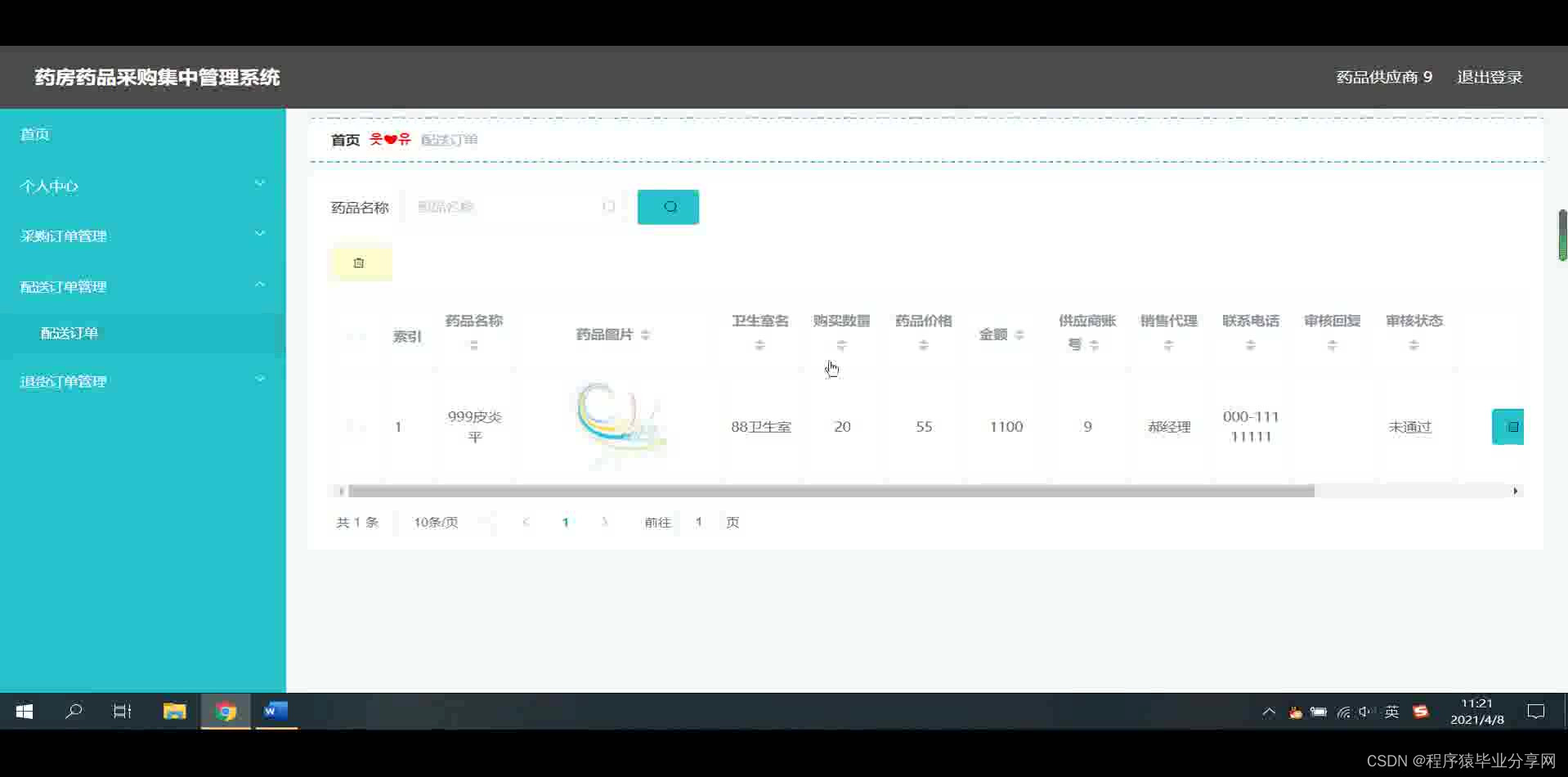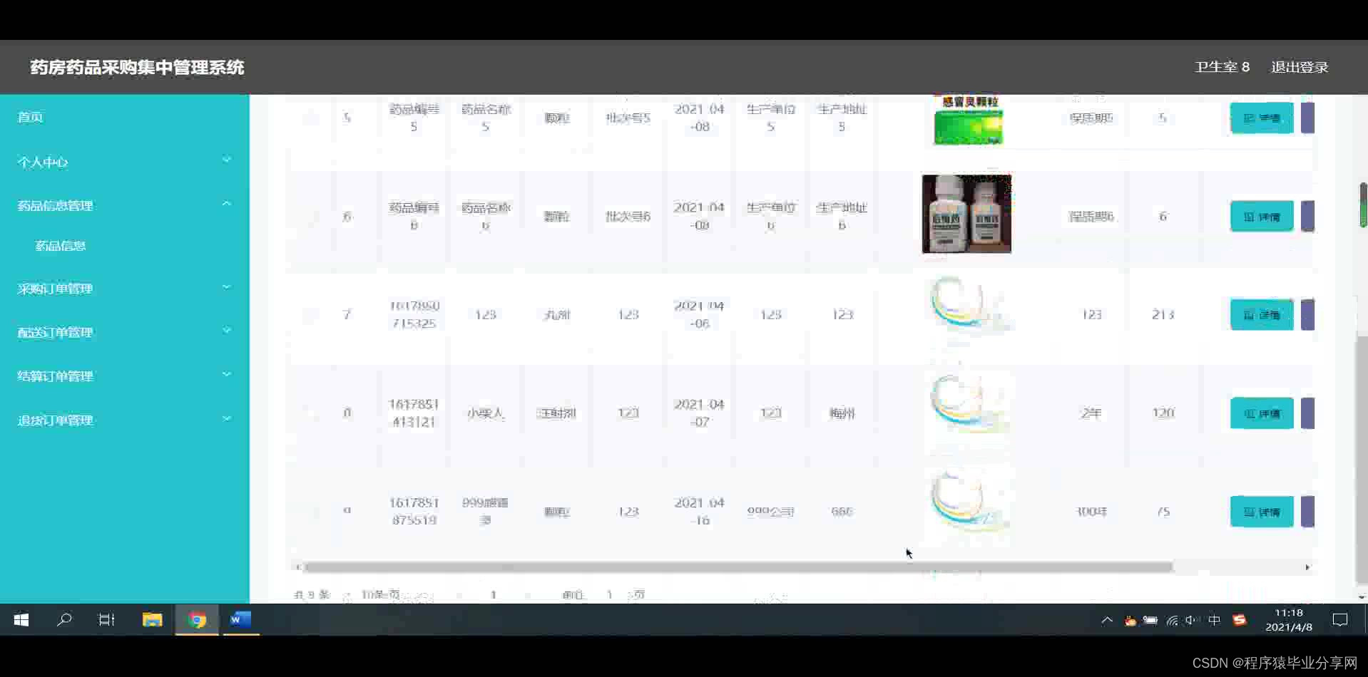 药房药品采购集中管理系统在Eclipse环境中,使用Java语言进行编码,使用Mysql创建数据表保存本系统产生的数据。系统可以提供信息显示和相应服务,系统可以实现采购订单管理,配送订单管理,结算订单管理,退货订单管理以及药品信息管理等功能。
