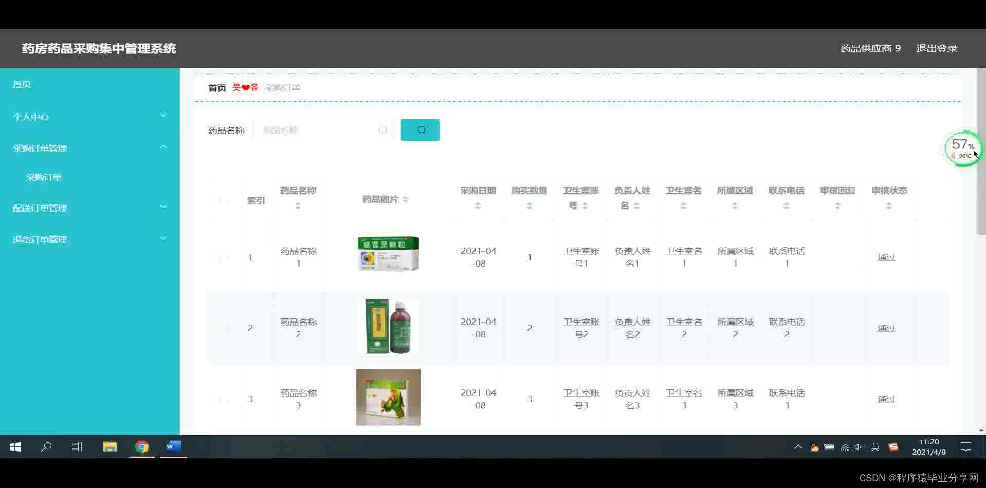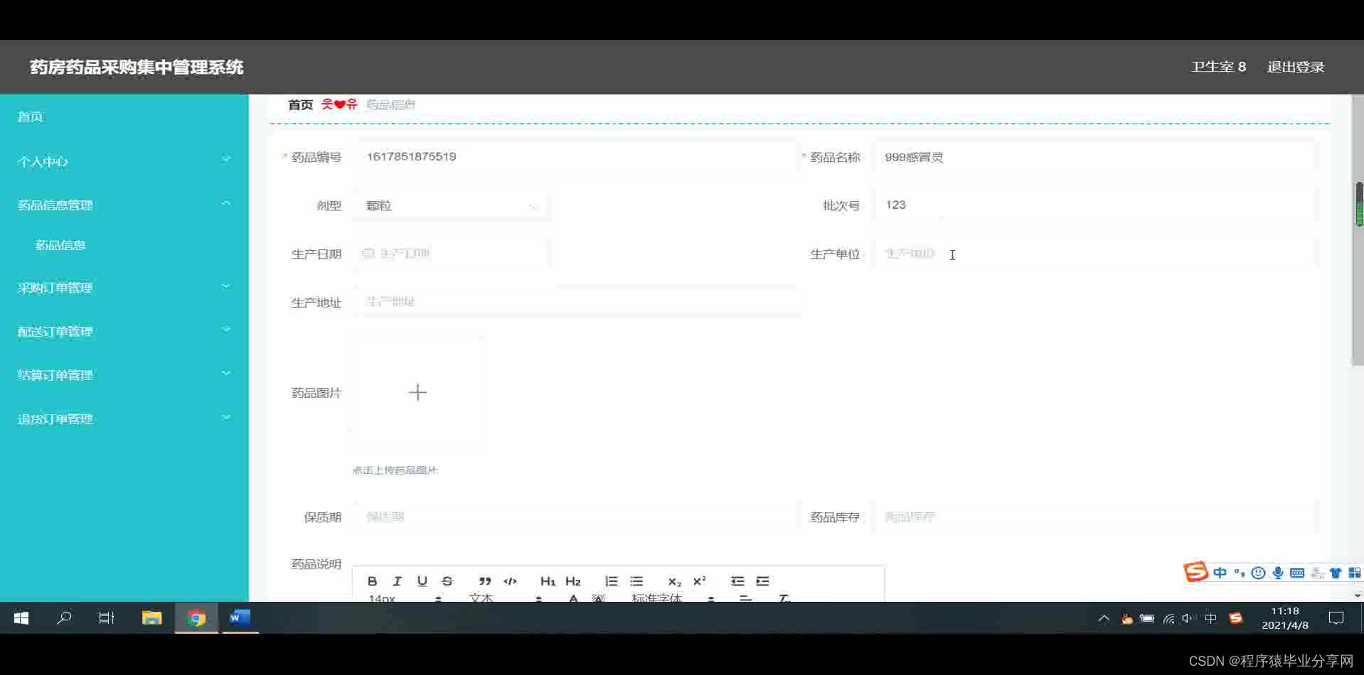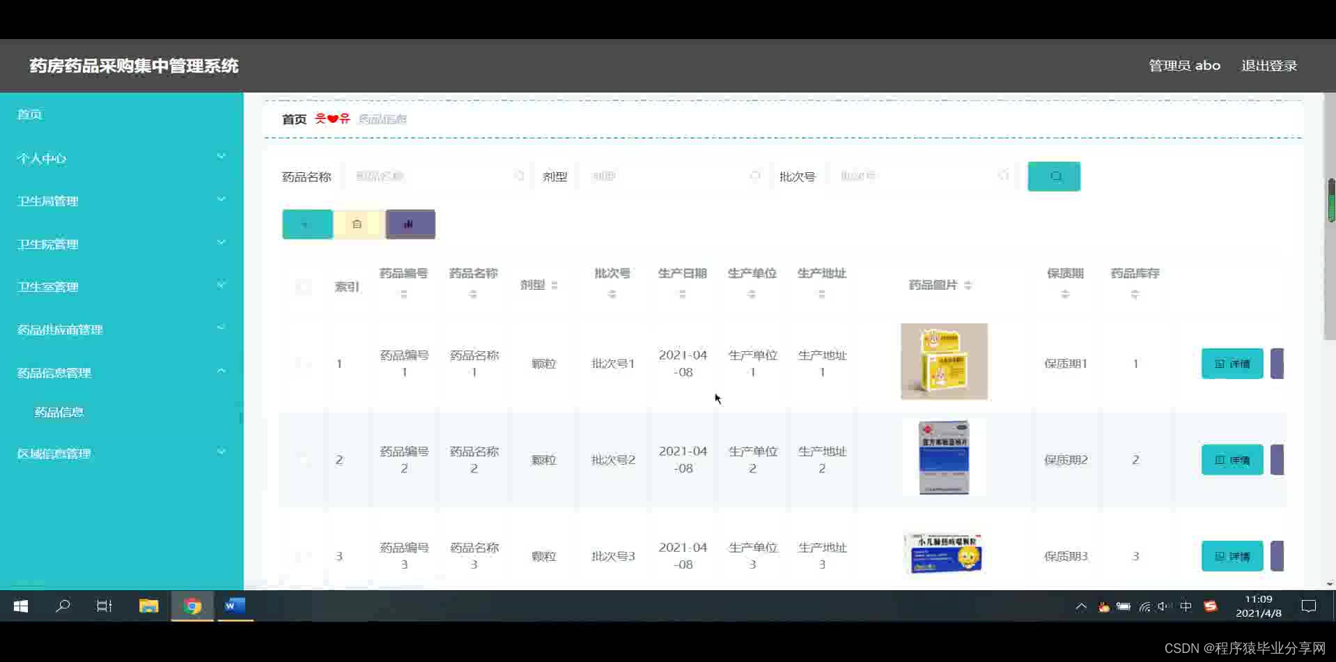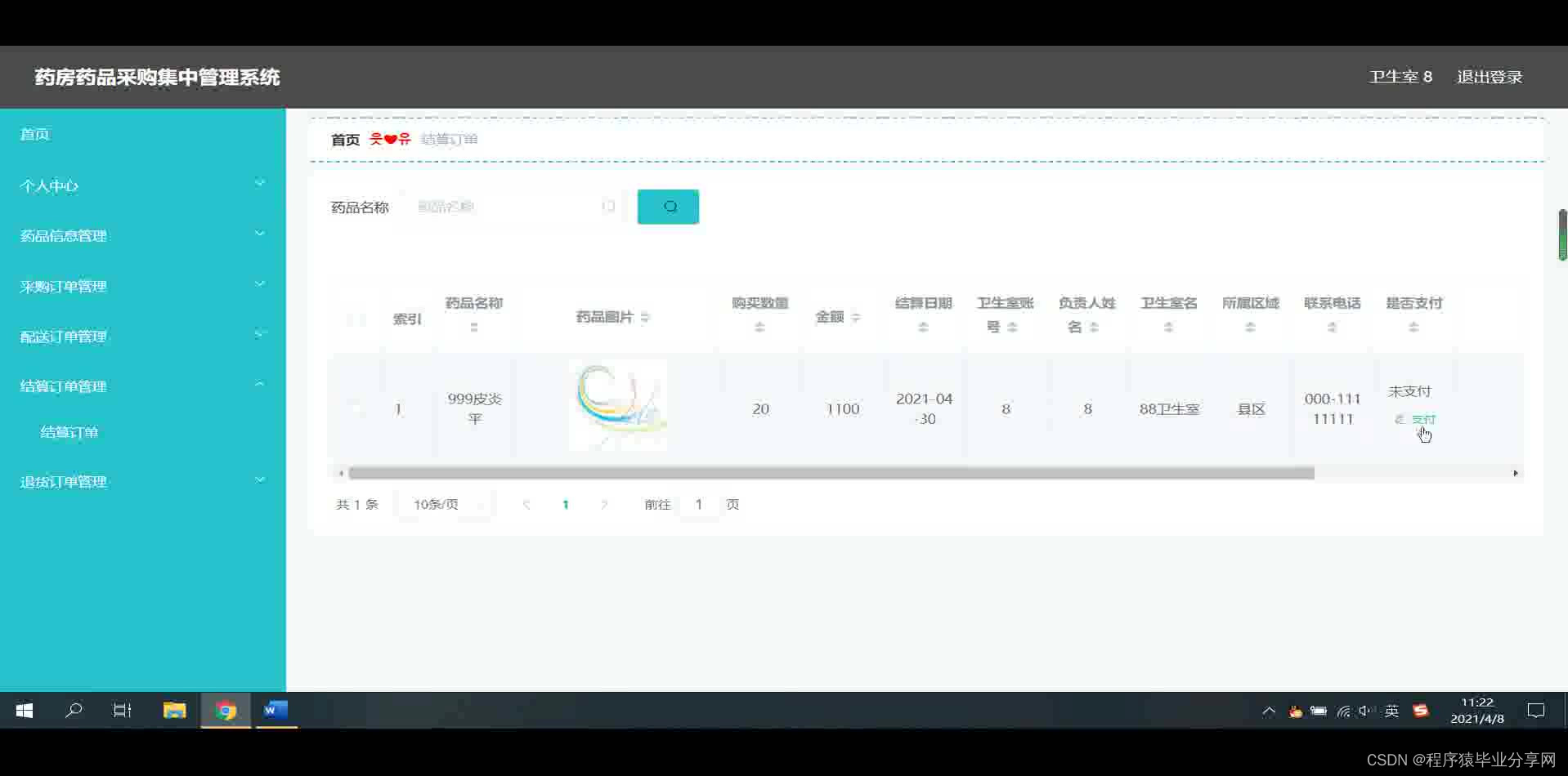 药房药品采购集中管理系统在Eclipse环境中,使用Java语言进行编码,使用Mysql创建数据表保存本系统产生的数据。系统可以提供信息显示和相应服务,系统可以实现采购订单管理,配送订单管理,结算订单管理,退货订单管理以及药品信息管理等功能。